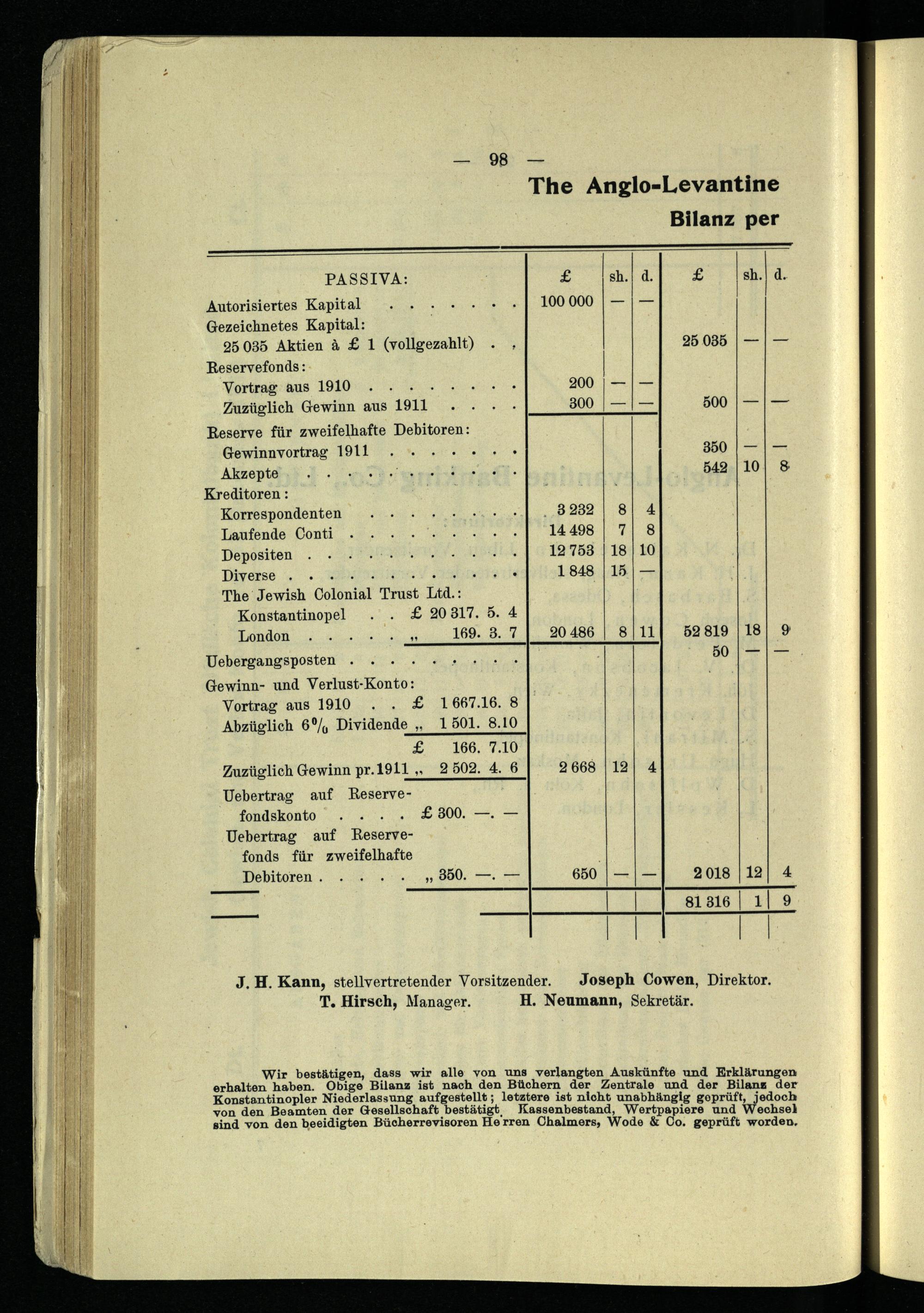Vermögen der Institutionen und Stiftungen der Zionistischen Organisation per 30. Juni 1913.