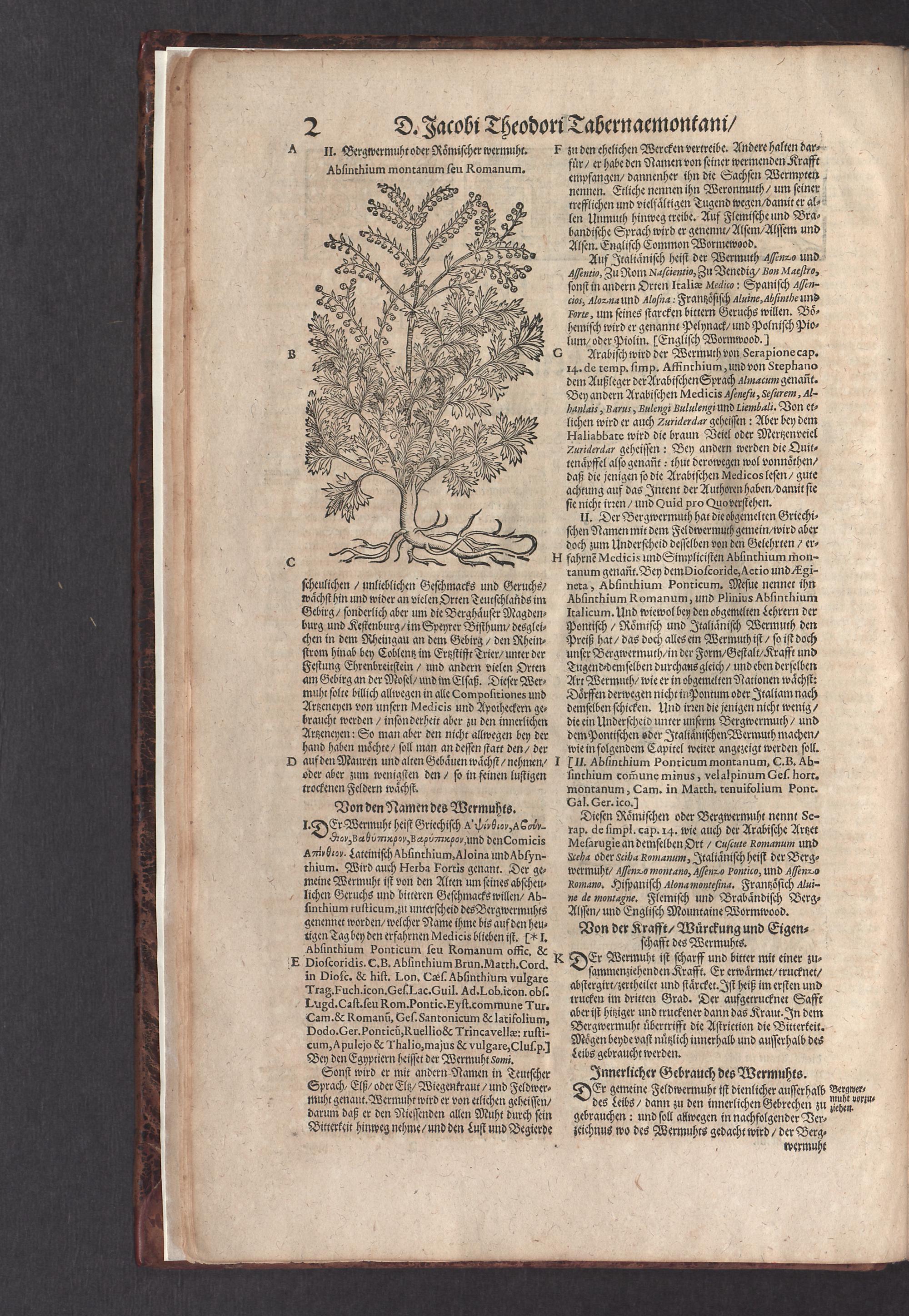 D. Jacobi Theodori Tabernaemontani, Neu vollkommen Kräuter-Buch : Darinnen Uber 3000. Kräuter/ mit schönen und kunstlichen Figuren/ auch deren Underscheid und Würckung/ samt ihren Namen in mancherley Sprachen/ beschrieben: Desgleichen auch/ wie dieselbige in allerhand Kranckheiten/ beyde der Menschen und des Viehs/ sollen angewendet und gebraucht werden/ angezeigt wird. Erstlichen durch Casparum Bauhinum D. und Profess. Basil. mit vielen neuen Figuren/ nutzlichen Artzneyen/ und anderem/ mit sonderem Fleis gebesseret/ Zum Andern Durch Hieronymum Bauhinum D. und Profess. Basil. mit sehr nutzlichen Marginalien, Synonimis, neuen Registeren und anderem vermehrt