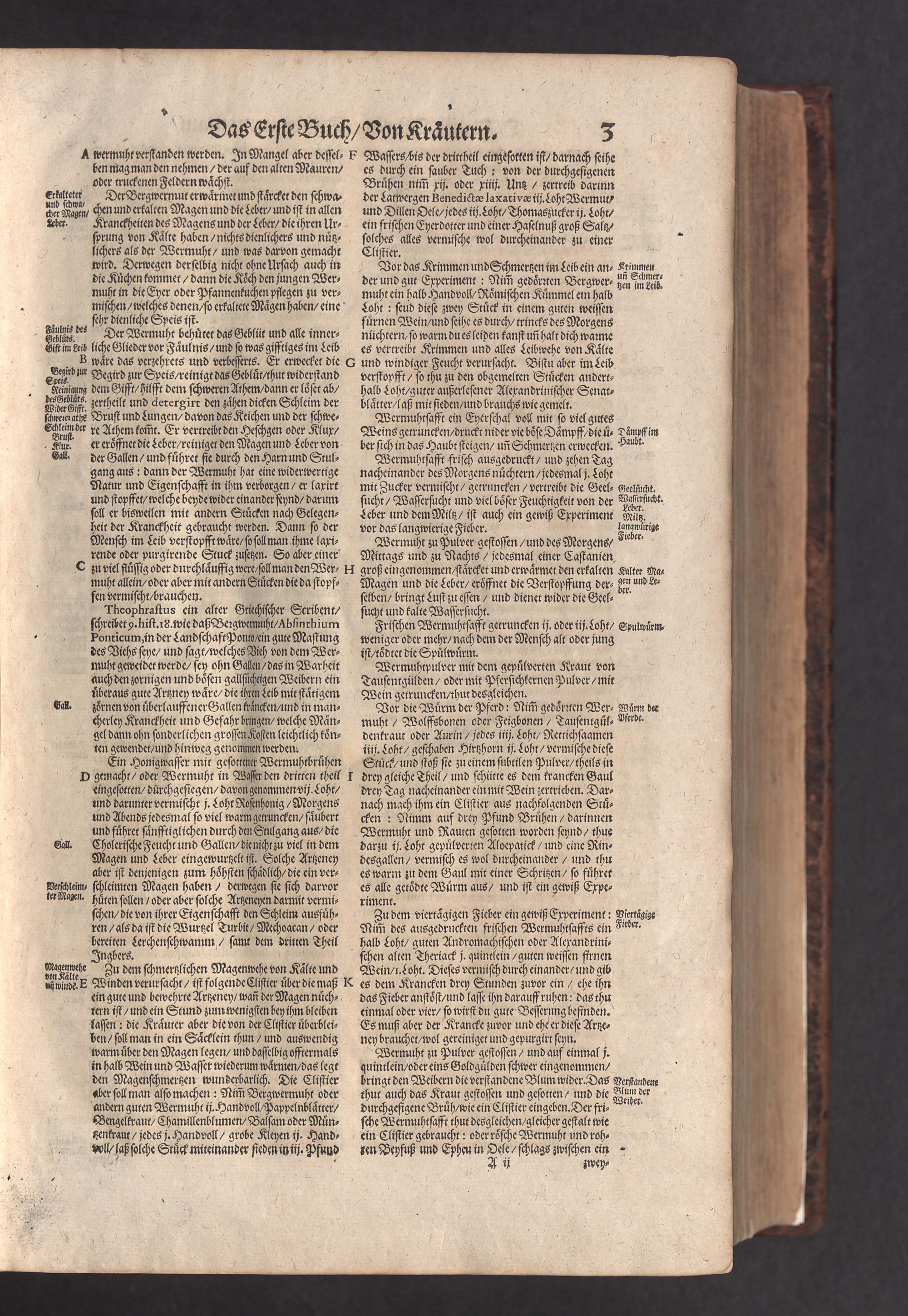 D. Jacobi Theodori Tabernaemontani, Neu vollkommen Kräuter-Buch : Darinnen Uber 3000. Kräuter/ mit schönen und kunstlichen Figuren/ auch deren Underscheid und Würckung/ samt ihren Namen in mancherley Sprachen/ beschrieben: Desgleichen auch/ wie dieselbige in allerhand Kranckheiten/ beyde der Menschen und des Viehs/ sollen angewendet und gebraucht werden/ angezeigt wird. Erstlichen durch Casparum Bauhinum D. und Profess. Basil. mit vielen neuen Figuren/ nutzlichen Artzneyen/ und anderem/ mit sonderem Fleis gebesseret/ Zum Andern Durch Hieronymum Bauhinum D. und Profess. Basil. mit sehr nutzlichen Marginalien, Synonimis, neuen Registeren und anderem vermehrt