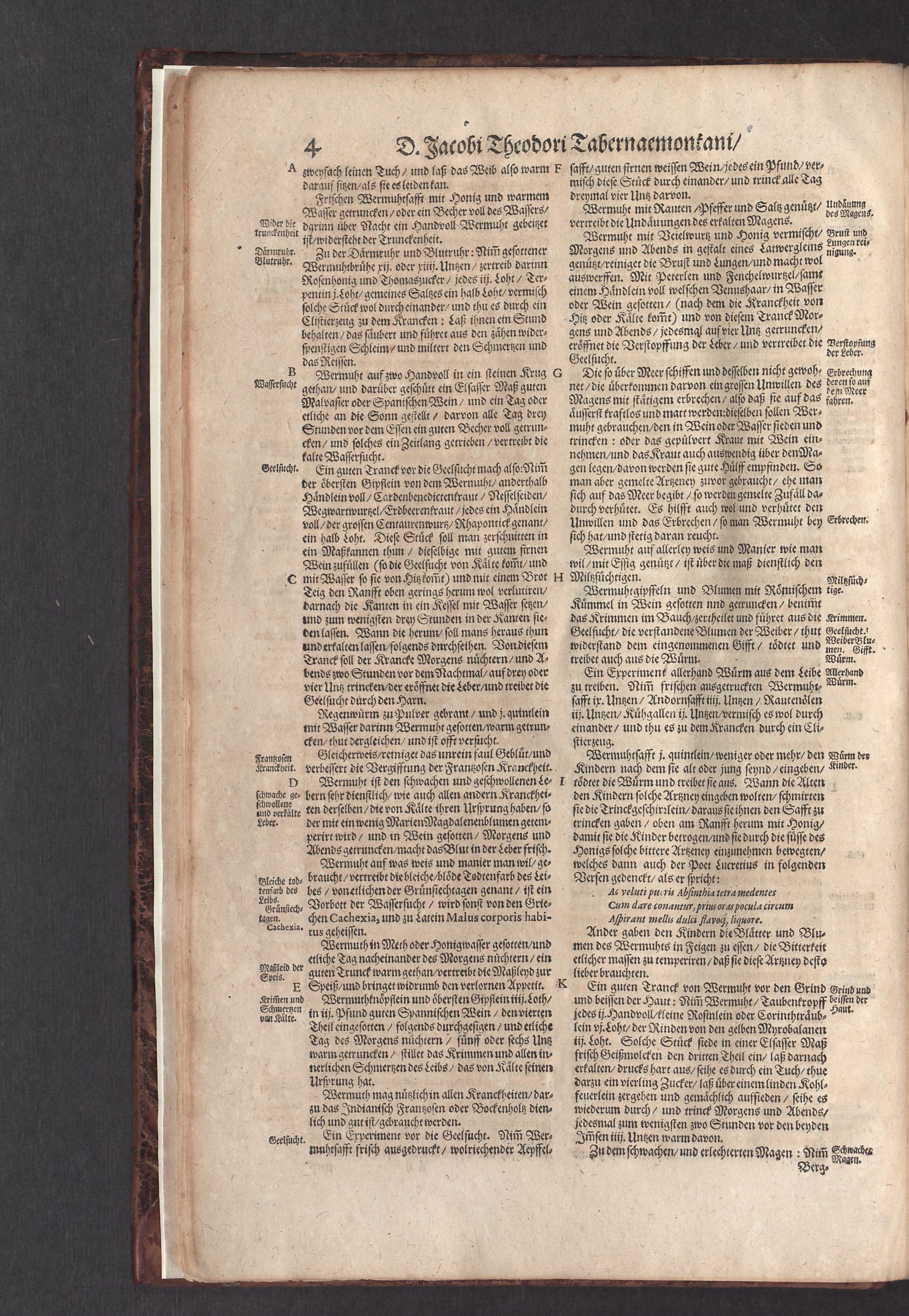 D. Jacobi Theodori Tabernaemontani, Neu vollkommen Kräuter-Buch : Darinnen Uber 3000. Kräuter/ mit schönen und kunstlichen Figuren/ auch deren Underscheid und Würckung/ samt ihren Namen in mancherley Sprachen/ beschrieben: Desgleichen auch/ wie dieselbige in allerhand Kranckheiten/ beyde der Menschen und des Viehs/ sollen angewendet und gebraucht werden/ angezeigt wird. Erstlichen durch Casparum Bauhinum D. und Profess. Basil. mit vielen neuen Figuren/ nutzlichen Artzneyen/ und anderem/ mit sonderem Fleis gebesseret/ Zum Andern Durch Hieronymum Bauhinum D. und Profess. Basil. mit sehr nutzlichen Marginalien, Synonimis, neuen Registeren und anderem vermehrt