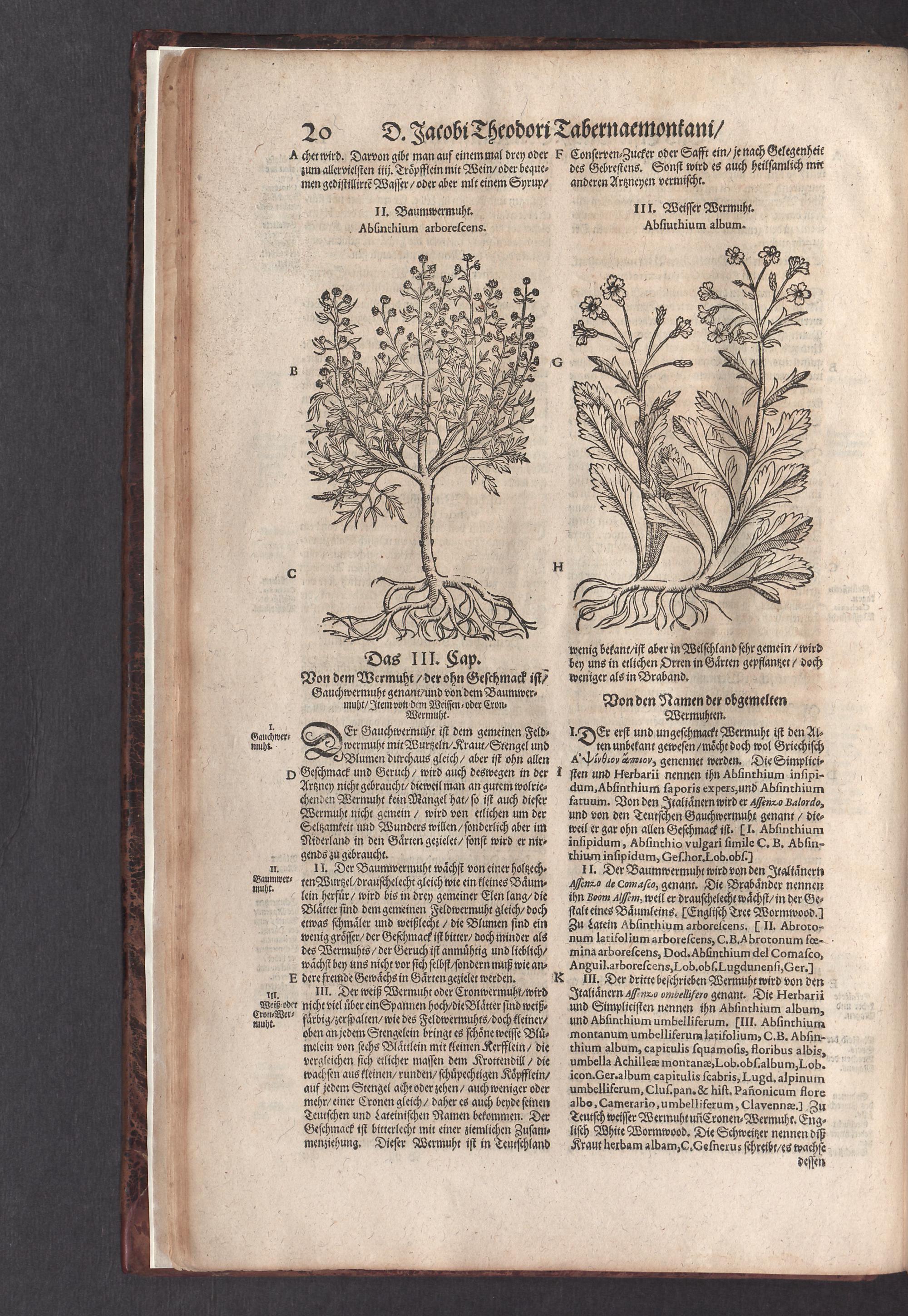 D. Jacobi Theodori Tabernaemontani, Neu vollkommen Kräuter-Buch : Darinnen Uber 3000. Kräuter/ mit schönen und kunstlichen Figuren/ auch deren Underscheid und Würckung/ samt ihren Namen in mancherley Sprachen/ beschrieben: Desgleichen auch/ wie dieselbige in allerhand Kranckheiten/ beyde der Menschen und des Viehs/ sollen angewendet und gebraucht werden/ angezeigt wird. Erstlichen durch Casparum Bauhinum D. und Profess. Basil. mit vielen neuen Figuren/ nutzlichen Artzneyen/ und anderem/ mit sonderem Fleis gebesseret/ Zum Andern Durch Hieronymum Bauhinum D. und Profess. Basil. mit sehr nutzlichen Marginalien, Synonimis, neuen Registeren und anderem vermehrt