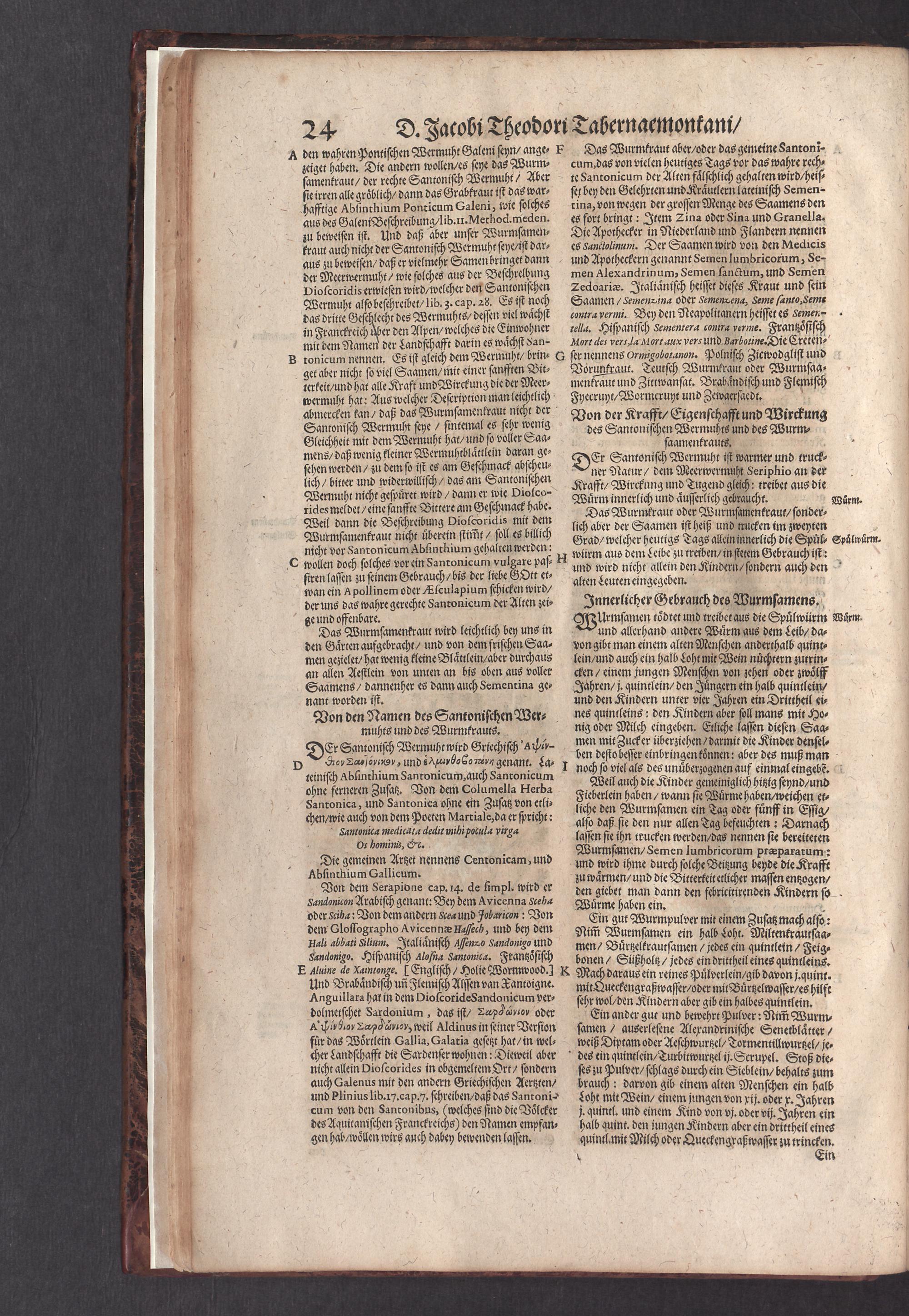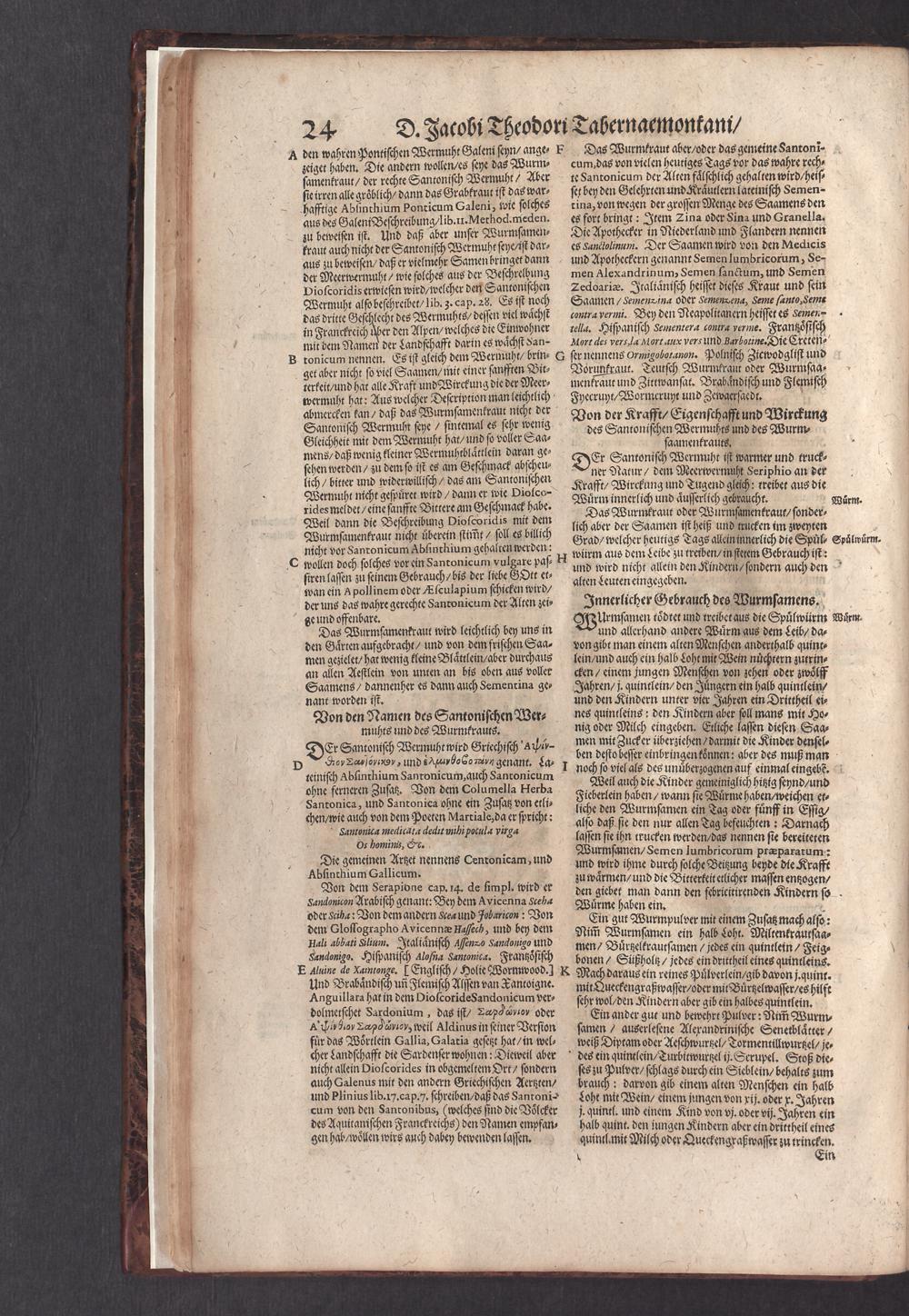 D. Jacobi Theodori Tabernaemontani, Neu vollkommen Kräuter-Buch : Darinnen Uber 3000. Kräuter/ mit schönen und kunstlichen Figuren/ auch deren Underscheid und Würckung/ samt ihren Namen in mancherley Sprachen/ beschrieben: Desgleichen auch/ wie dieselbige in allerhand Kranckheiten/ beyde der Menschen und des Viehs/ sollen angewendet und gebraucht werden/ angezeigt wird. Erstlichen durch Casparum Bauhinum D. und Profess. Basil. mit vielen neuen Figuren/ nutzlichen Artzneyen/ und anderem/ mit sonderem Fleis gebesseret/ Zum Andern Durch Hieronymum Bauhinum D. und Profess. Basil. mit sehr nutzlichen Marginalien, Synonimis, neuen Registeren und anderem vermehrt