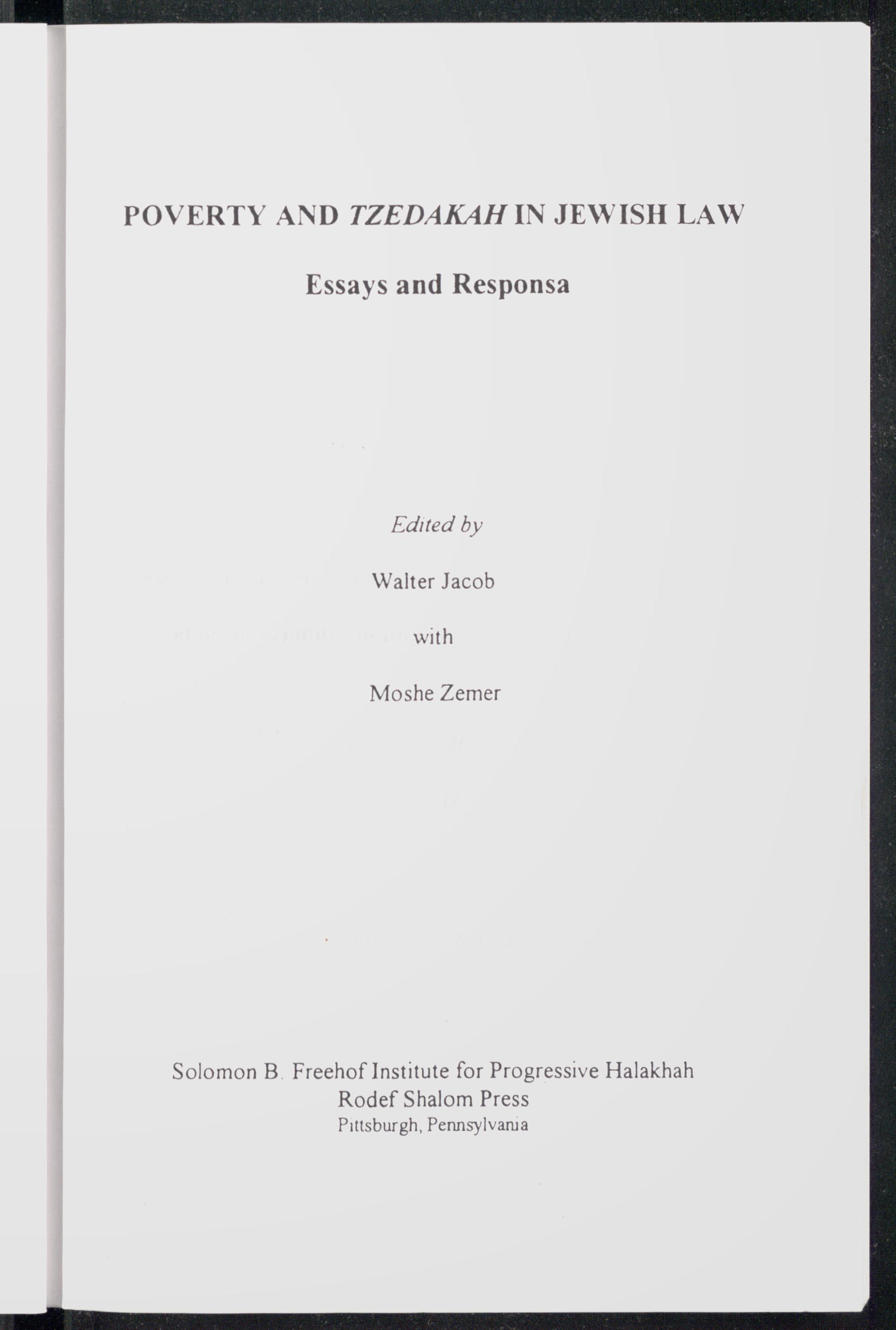 Poverty and tzedakah in Jewish law : essays and responsa / edited by Walter Jacob with Moshe Zemer