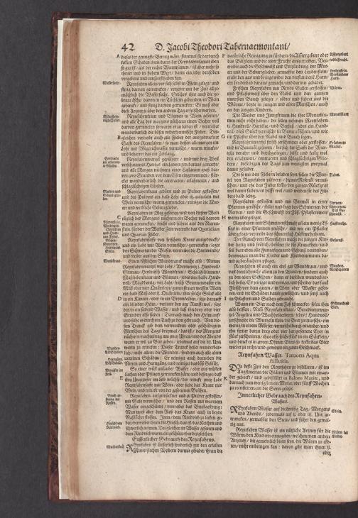 D. Jacobi Theodori Tabernaemontani, Neu vollkommen Kräuter-Buch : Darinnen Uber 3000. Kräuter/ mit schönen und kunstlichen Figuren/ auch deren Underscheid und Würckung/ samt ihren Namen in mancherley Sprachen/ beschrieben: Desgleichen auch/ wie dieselbige in allerhand Kranckheiten/ beyde der Menschen und des Viehs/ sollen angewendet und gebraucht werden/ angezeigt wird. Erstlichen durch Casparum Bauhinum D. und Profess. Basil. mit vielen neuen Figuren/ nutzlichen Artzneyen/ und anderem/ mit sonderem Fleis gebesseret/ Zum Andern Durch Hieronymum Bauhinum D. und Profess. Basil. mit sehr nutzlichen Marginalien, Synonimis, neuen Registeren und anderem vermehrt
