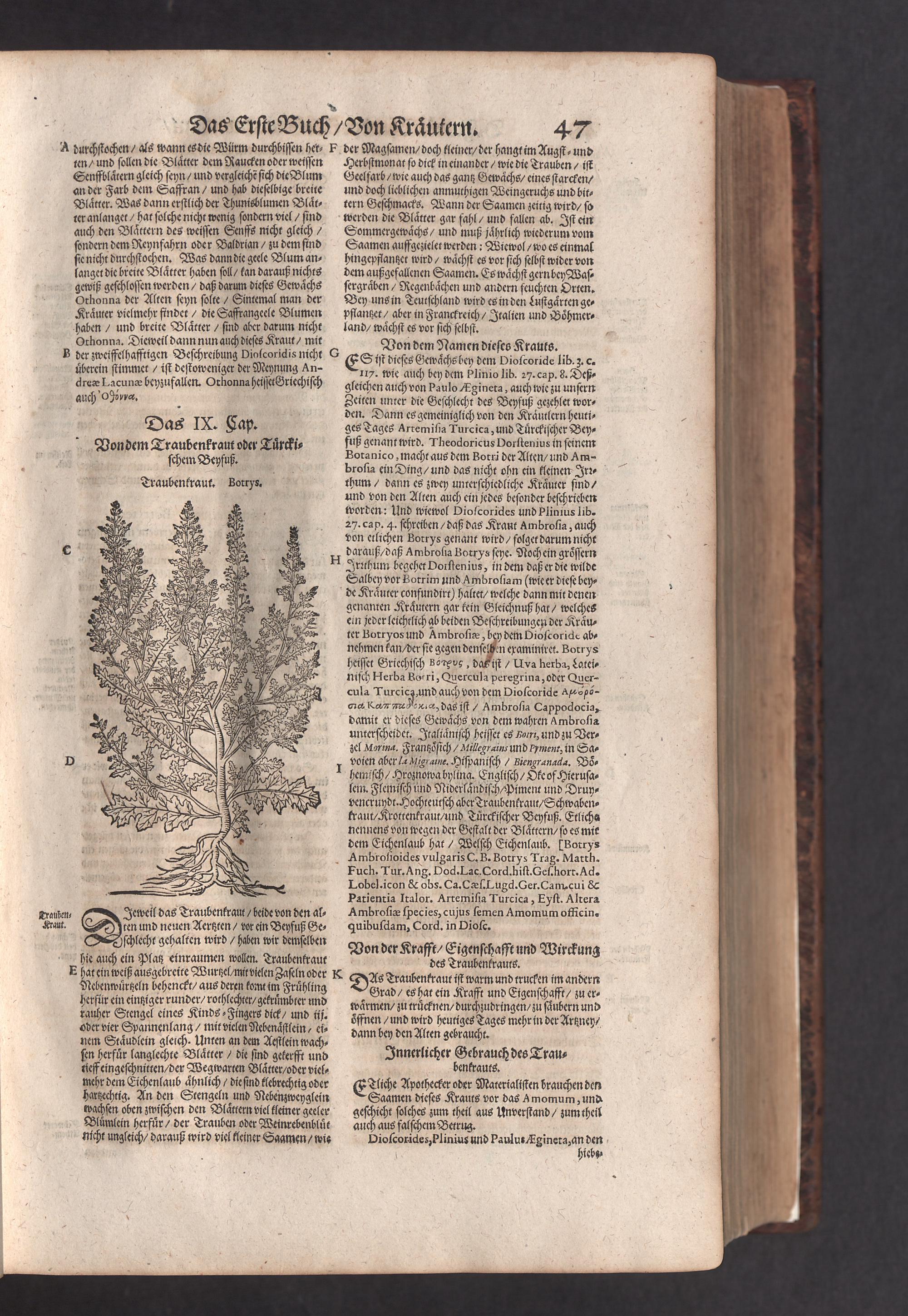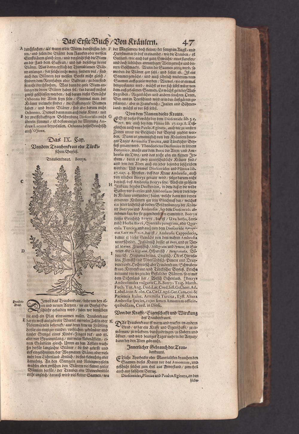 D. Jacobi Theodori Tabernaemontani, Neu vollkommen Kräuter-Buch : Darinnen Uber 3000. Kräuter/ mit schönen und kunstlichen Figuren/ auch deren Underscheid und Würckung/ samt ihren Namen in mancherley Sprachen/ beschrieben: Desgleichen auch/ wie dieselbige in allerhand Kranckheiten/ beyde der Menschen und des Viehs/ sollen angewendet und gebraucht werden/ angezeigt wird. Erstlichen durch Casparum Bauhinum D. und Profess. Basil. mit vielen neuen Figuren/ nutzlichen Artzneyen/ und anderem/ mit sonderem Fleis gebesseret/ Zum Andern Durch Hieronymum Bauhinum D. und Profess. Basil. mit sehr nutzlichen Marginalien, Synonimis, neuen Registeren und anderem vermehrt