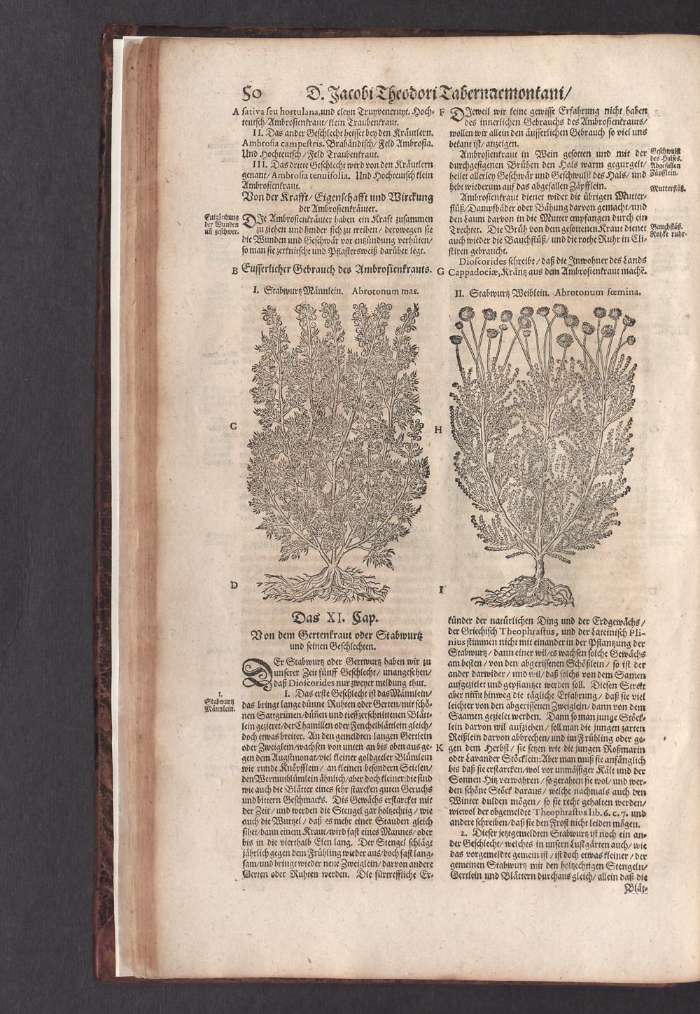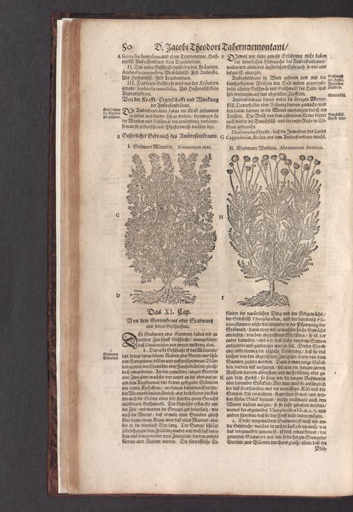 D. Jacobi Theodori Tabernaemontani, Neu vollkommen Kräuter-Buch : Darinnen Uber 3000. Kräuter/ mit schönen und kunstlichen Figuren/ auch deren Underscheid und Würckung/ samt ihren Namen in mancherley Sprachen/ beschrieben: Desgleichen auch/ wie dieselbige in allerhand Kranckheiten/ beyde der Menschen und des Viehs/ sollen angewendet und gebraucht werden/ angezeigt wird. Erstlichen durch Casparum Bauhinum D. und Profess. Basil. mit vielen neuen Figuren/ nutzlichen Artzneyen/ und anderem/ mit sonderem Fleis gebesseret/ Zum Andern Durch Hieronymum Bauhinum D. und Profess. Basil. mit sehr nutzlichen Marginalien, Synonimis, neuen Registeren und anderem vermehrt