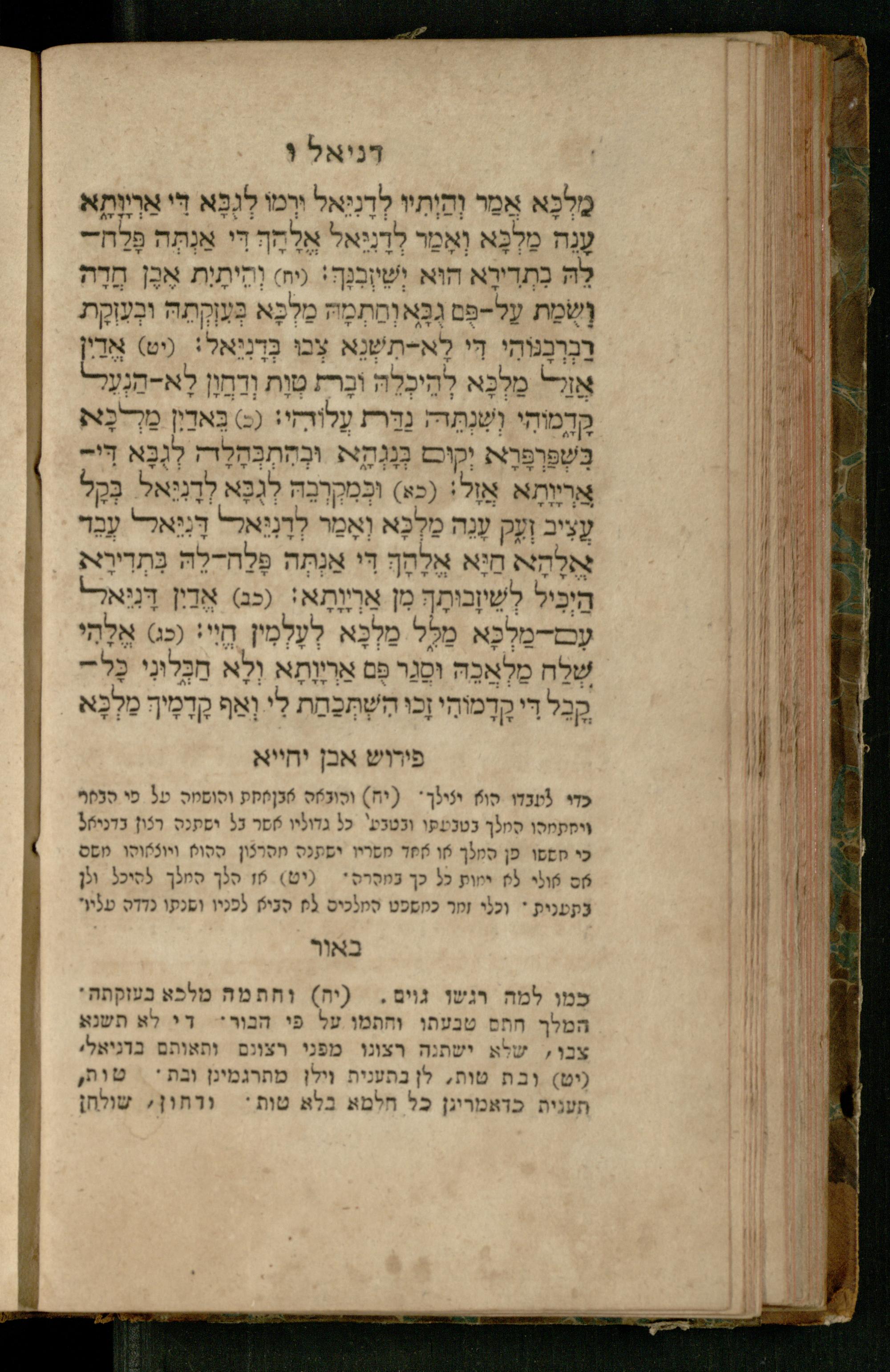 Sefer Daniʾel : meturgam bi-leshon Ashkenazi / me-et Ṿolf ben Yosef u-mevoʾar me-et Mosheh ben Uri Feivesh ṿe-nilṿeh elaṿ perush ha-Rav Ibn Yaḥyaספר דניאל : מתורגם בלשון אשכנזי / מאת וואלף בן יוסף ומבואר מאת משה בן אורי פייבש ונלוה אליו פירוש הרב אבן יחייא