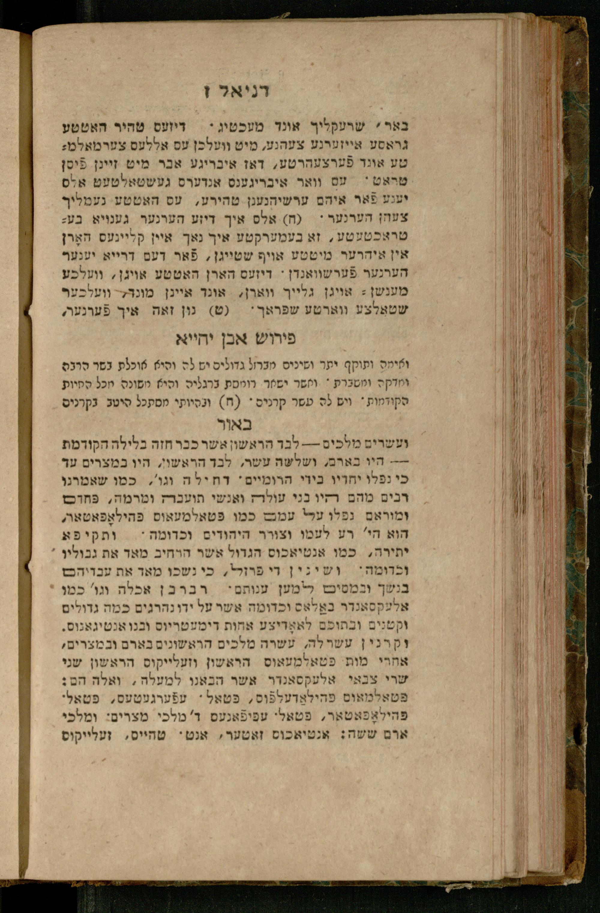 Sefer Daniʾel : meturgam bi-leshon Ashkenazi / me-et Ṿolf ben Yosef u-mevoʾar me-et Mosheh ben Uri Feivesh ṿe-nilṿeh elaṿ perush ha-Rav Ibn Yaḥyaספר דניאל : מתורגם בלשון אשכנזי / מאת וואלף בן יוסף ומבואר מאת משה בן אורי פייבש ונלוה אליו פירוש הרב אבן יחייא