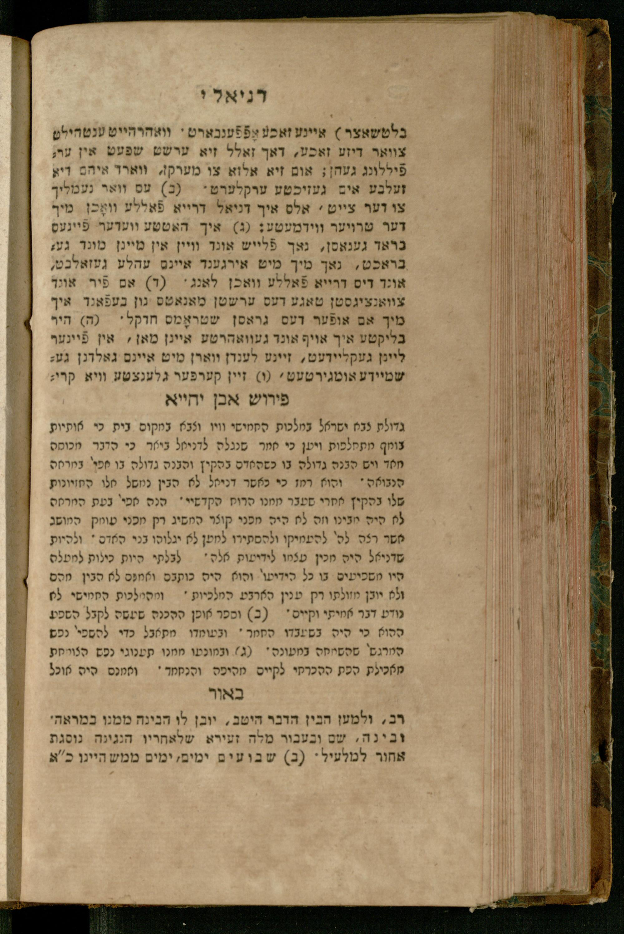 Sefer Daniʾel : meturgam bi-leshon Ashkenazi / me-et Ṿolf ben Yosef u-mevoʾar me-et Mosheh ben Uri Feivesh ṿe-nilṿeh elaṿ perush ha-Rav Ibn Yaḥyaספר דניאל : מתורגם בלשון אשכנזי / מאת וואלף בן יוסף ומבואר מאת משה בן אורי פייבש ונלוה אליו פירוש הרב אבן יחייא