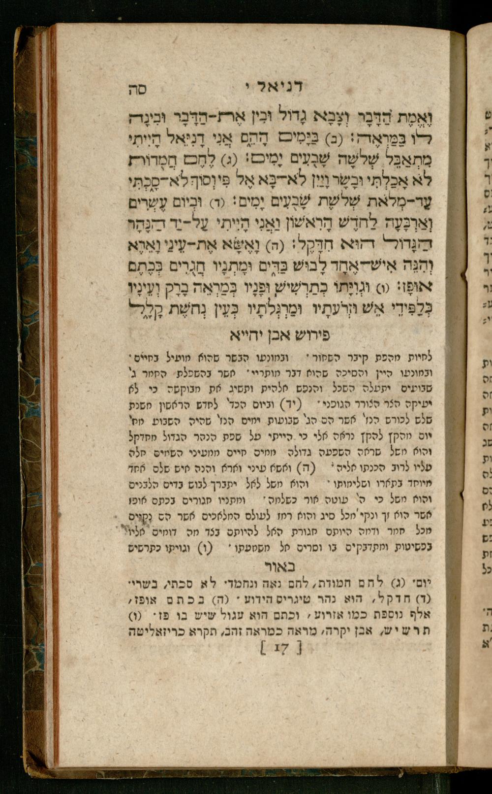 Sefer Daniʾel : meturgam bi-leshon Ashkenazi / me-et Ṿolf ben Yosef u-mevoʾar me-et Mosheh ben Uri Feivesh ṿe-nilṿeh elaṿ perush ha-Rav Ibn Yaḥyaספר דניאל : מתורגם בלשון אשכנזי / מאת וואלף בן יוסף ומבואר מאת משה בן אורי פייבש ונלוה אליו פירוש הרב אבן יחייא