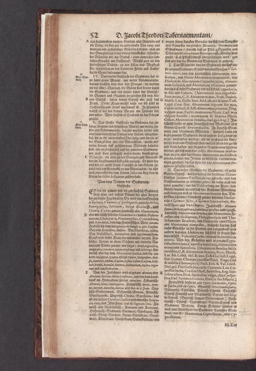 D. Jacobi Theodori Tabernaemontani, Neu vollkommen Kräuter-Buch : Darinnen Uber 3000. Kräuter/ mit schönen und kunstlichen Figuren/ auch deren Underscheid und Würckung/ samt ihren Namen in mancherley Sprachen/ beschrieben: Desgleichen auch/ wie dieselbige in allerhand Kranckheiten/ beyde der Menschen und des Viehs/ sollen angewendet und gebraucht werden/ angezeigt wird. Erstlichen durch Casparum Bauhinum D. und Profess. Basil. mit vielen neuen Figuren/ nutzlichen Artzneyen/ und anderem/ mit sonderem Fleis gebesseret/ Zum Andern Durch Hieronymum Bauhinum D. und Profess. Basil. mit sehr nutzlichen Marginalien, Synonimis, neuen Registeren und anderem vermehrt