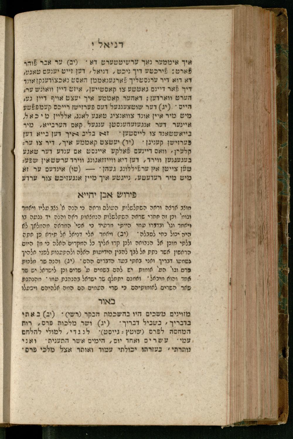 Sefer Daniʾel : meturgam bi-leshon Ashkenazi / me-et Ṿolf ben Yosef u-mevoʾar me-et Mosheh ben Uri Feivesh ṿe-nilṿeh elaṿ perush ha-Rav Ibn Yaḥyaספר דניאל : מתורגם בלשון אשכנזי / מאת וואלף בן יוסף ומבואר מאת משה בן אורי פייבש ונלוה אליו פירוש הרב אבן יחייא