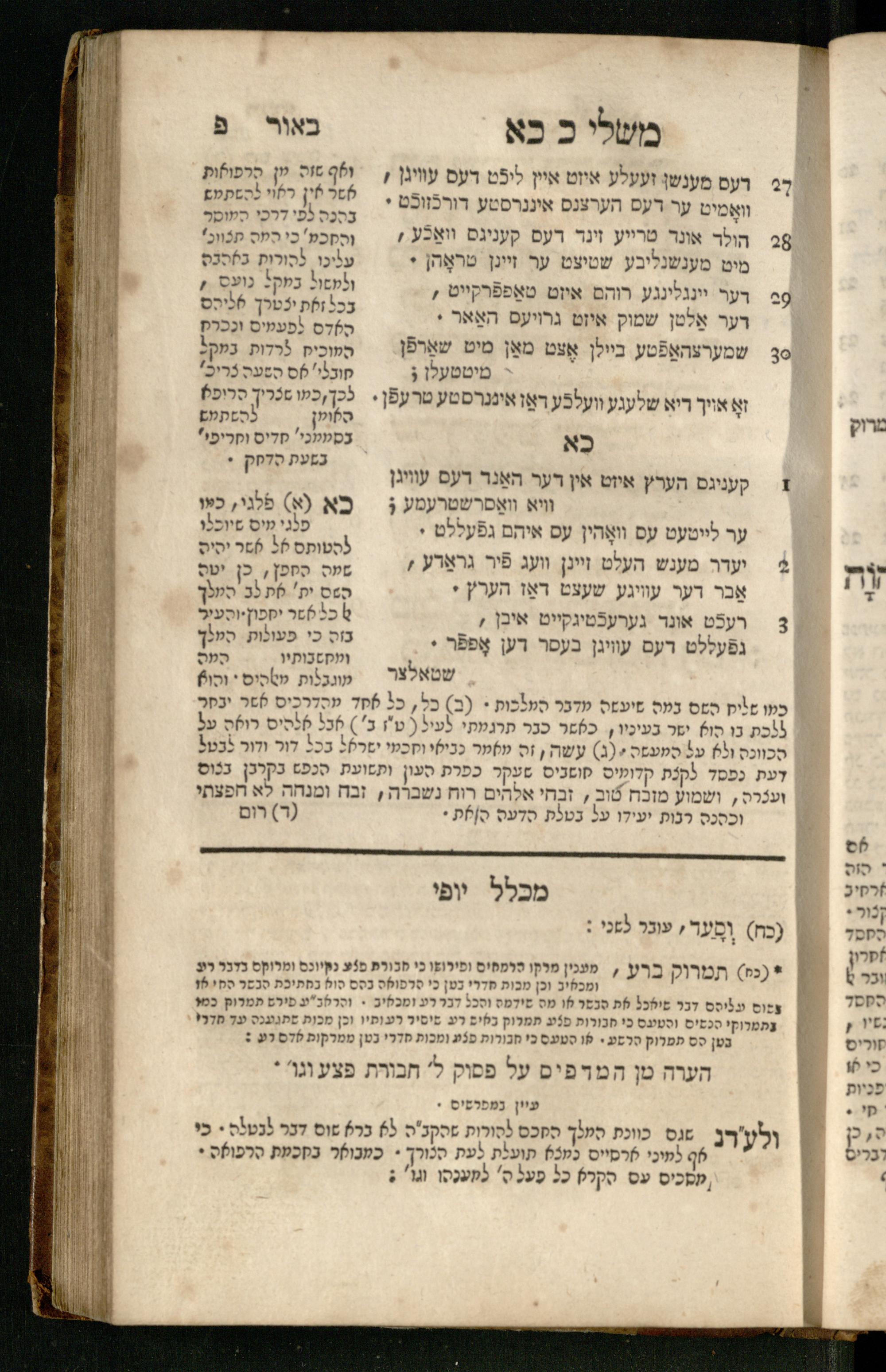 Mishle : ʿim beʾur ṿe-targum Ashkenazi : ke-asher nidpas be-ḳ.ḳ Berlin u-be-Ṿin ... nidpas gam Pe. Rashi ṿe-Sefer Mikhlal Yofi ʿim tosefet Leḳeṭ shikheḥah / asher hosif ʿalenu ... Yaʿaḳov Abendanahמשלי : עם ביאור ותרגום אשכנזי כאשר נדפס כאשר נדפס בק״ק ברלין ובווין ... נדפס גם פירש״י וספר מכלל יופי עם תוספת לקט שכחה / אשר הוסיף עליו ... יעקב אבנדאנה