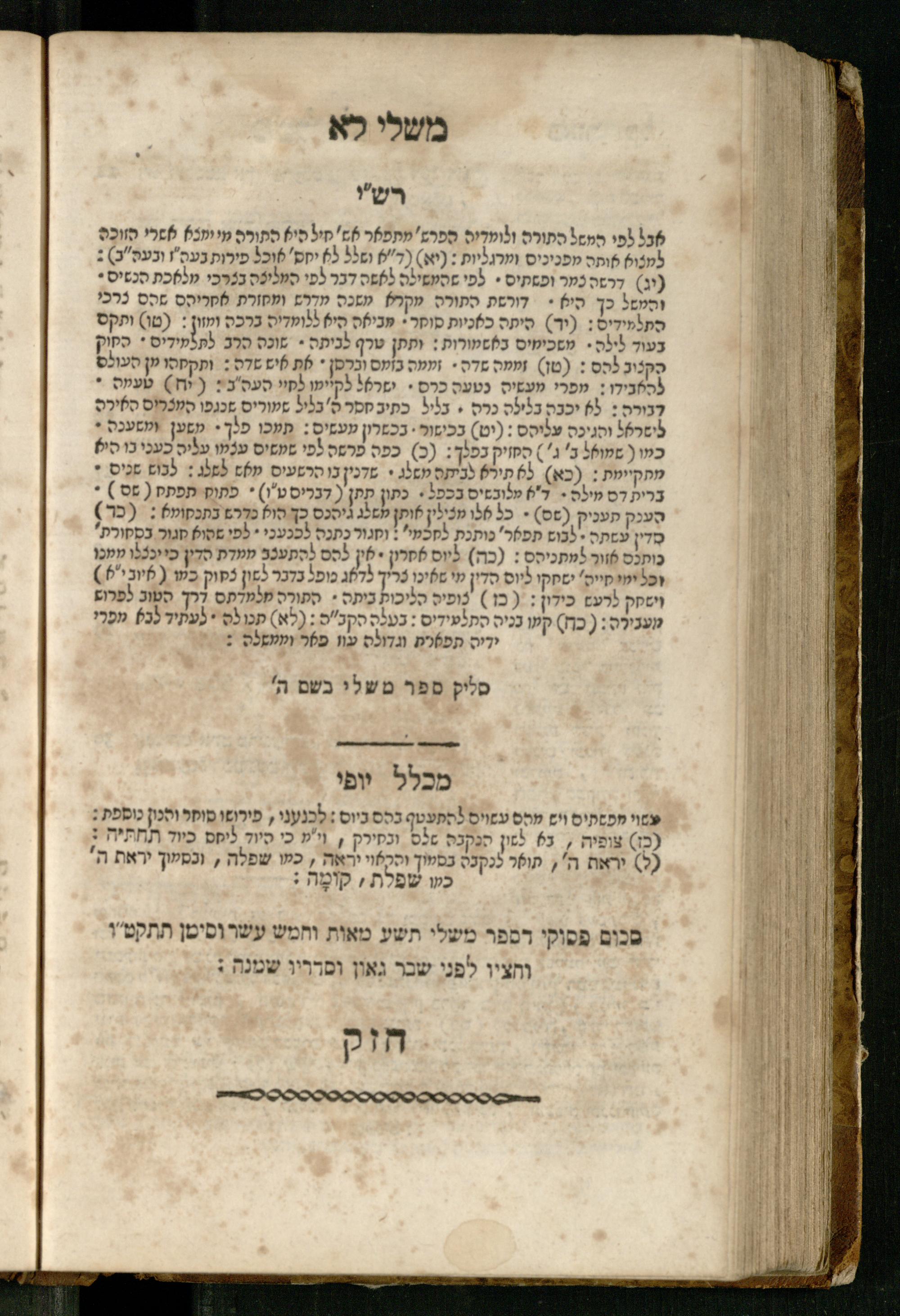 Mishle : ʿim beʾur ṿe-targum Ashkenazi : ke-asher nidpas be-ḳ.ḳ Berlin u-be-Ṿin ... nidpas gam Pe. Rashi ṿe-Sefer Mikhlal Yofi ʿim tosefet Leḳeṭ shikheḥah / asher hosif ʿalenu ... Yaʿaḳov Abendanahמשלי : עם ביאור ותרגום אשכנזי כאשר נדפס כאשר נדפס בק״ק ברלין ובווין ... נדפס גם פירש״י וספר מכלל יופי עם תוספת לקט שכחה / אשר הוסיף עליו ... יעקב אבנדאנה