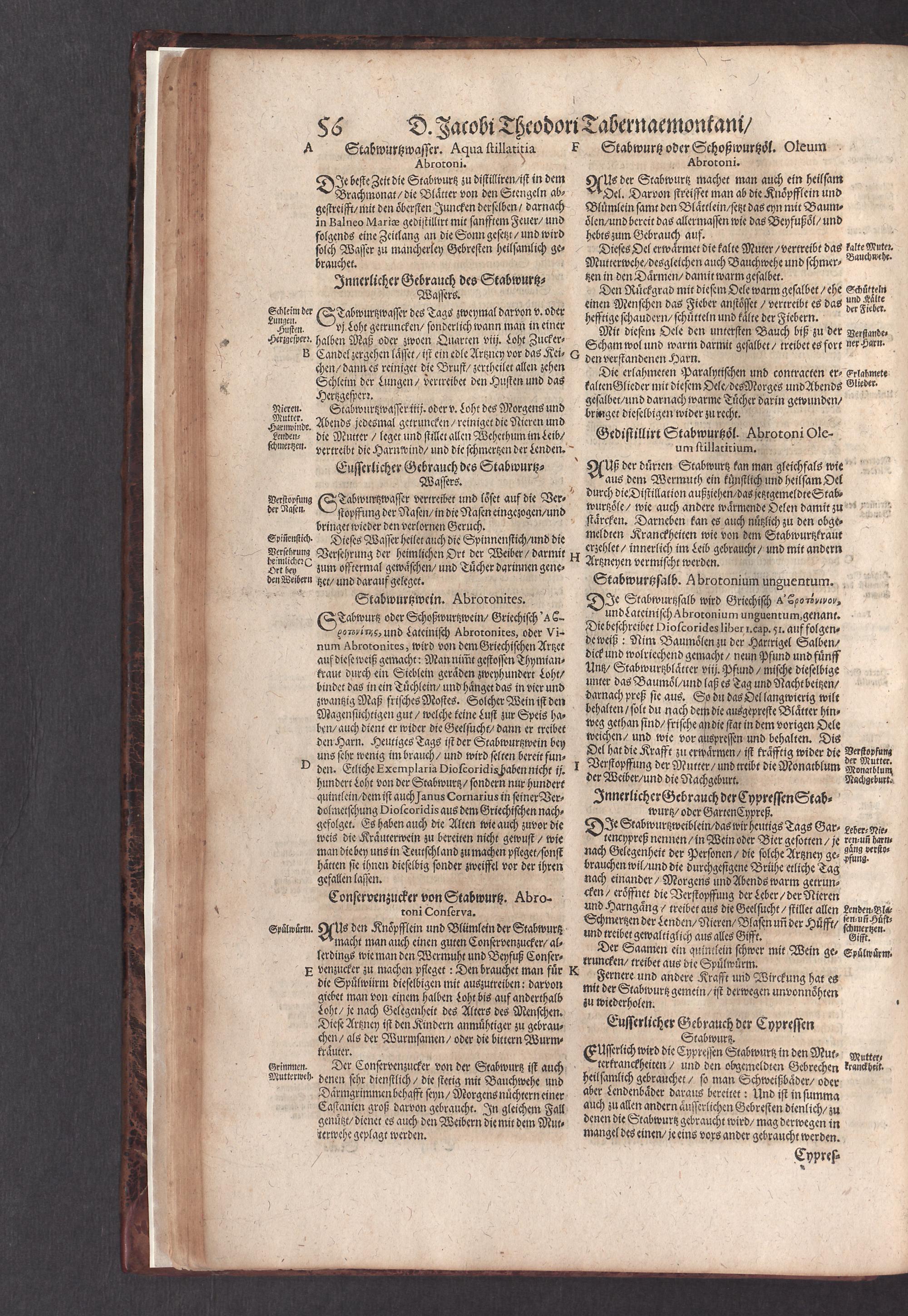 D. Jacobi Theodori Tabernaemontani, Neu vollkommen Kräuter-Buch : Darinnen Uber 3000. Kräuter/ mit schönen und kunstlichen Figuren/ auch deren Underscheid und Würckung/ samt ihren Namen in mancherley Sprachen/ beschrieben: Desgleichen auch/ wie dieselbige in allerhand Kranckheiten/ beyde der Menschen und des Viehs/ sollen angewendet und gebraucht werden/ angezeigt wird. Erstlichen durch Casparum Bauhinum D. und Profess. Basil. mit vielen neuen Figuren/ nutzlichen Artzneyen/ und anderem/ mit sonderem Fleis gebesseret/ Zum Andern Durch Hieronymum Bauhinum D. und Profess. Basil. mit sehr nutzlichen Marginalien, Synonimis, neuen Registeren und anderem vermehrt