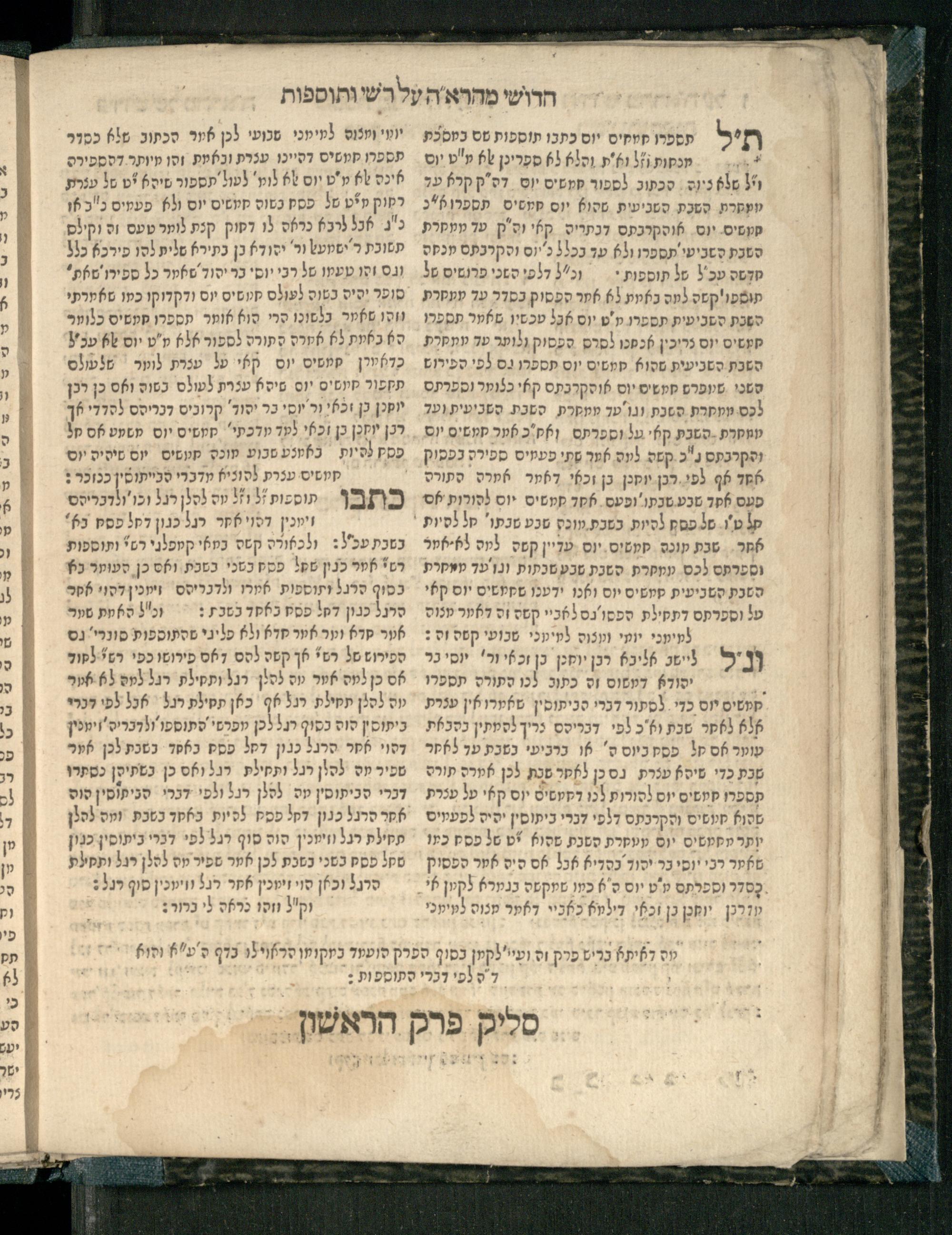 Masekhet Megilat Taʿanit : reʾeh zeh ḥadash asher lo hayah le-ʿolami masekhet zo ʿim perush maspiḳ she-nilḳaṭ min sugyot u-masḳanot Talmud Bavli ṿe-Talmud Yerushalmi, min Rashi ṿe-Tosafo. u-lifʿamim me-ḥadesh ha-meḥaber perush ... ṿe-niḳra shemo Perush kolel shel Maharʾah ʿal shem she-kolel kol ha-perushim Perush Rashi ṿe-Tosafot ... gam perush ʿal ha-Milo. zarot a.p. sefer ha-neḥmad ʿArukh ḥadash ṿe-hemah mi-tsad a. shel zeh ha-sefer u-mi-tsad ha-b. ḥidushe ha-meḥaber ... Ṿe-niḳraʾim Ḥidushe Maharah ʿal shemo ... Avraham ha-Leṿi ben ... Yosef Segal ... ben ... Avraham Perets Segal ... mi-ḳ.ḳ Ḳraḳa ...מסכת מגילת תענית : ראה זה חדש אשר לא היה לעולמי׳ מסכת זו עם פירוש מספיק שנילקט מן סוגיות ומסקנות תלמוד בבלי ותלמוד ירושלמי, מן רש״י ותוספו׳ ולפעמים מחדש המחבר פירוש ... ונקרא שמו פירוש כולל של מהרא״ה על שם שכולל כל הפירושים פירוש רש״י ותוספות ... גם פירוש על המלו׳ זרות ע״פ ספר הנחמד ערוך חדש והמה מצד א׳ של זה ספר ומצד הב׳ חידושי המחבר ... ונקראים חידושי מהרא״ה על שמו ... אברהם הלוי בן ... יוסף סג״ל ... בן ... אברהם פרץ סג״ל ... מק״ק קראקא