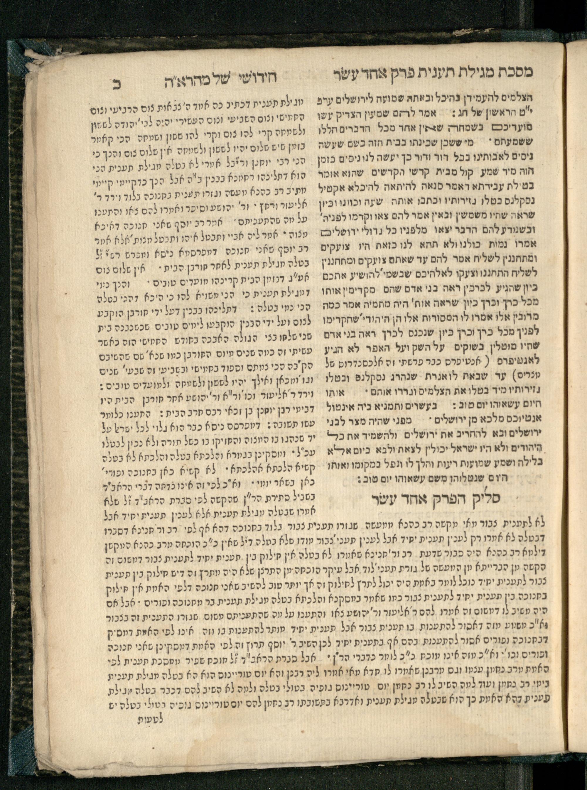 Masekhet Megilat Taʿanit : reʾeh zeh ḥadash asher lo hayah le-ʿolami masekhet zo ʿim perush maspiḳ she-nilḳaṭ min sugyot u-masḳanot Talmud Bavli ṿe-Talmud Yerushalmi, min Rashi ṿe-Tosafo. u-lifʿamim me-ḥadesh ha-meḥaber perush ... ṿe-niḳra shemo Perush kolel shel Maharʾah ʿal shem she-kolel kol ha-perushim Perush Rashi ṿe-Tosafot ... gam perush ʿal ha-Milo. zarot a.p. sefer ha-neḥmad ʿArukh ḥadash ṿe-hemah mi-tsad a. shel zeh ha-sefer u-mi-tsad ha-b. ḥidushe ha-meḥaber ... Ṿe-niḳraʾim Ḥidushe Maharah ʿal shemo ... Avraham ha-Leṿi ben ... Yosef Segal ... ben ... Avraham Perets Segal ... mi-ḳ.ḳ Ḳraḳa ...מסכת מגילת תענית : ראה זה חדש אשר לא היה לעולמי׳ מסכת זו עם פירוש מספיק שנילקט מן סוגיות ומסקנות תלמוד בבלי ותלמוד ירושלמי, מן רש״י ותוספו׳ ולפעמים מחדש המחבר פירוש ... ונקרא שמו פירוש כולל של מהרא״ה על שם שכולל כל הפירושים פירוש רש״י ותוספות ... גם פירוש על המלו׳ זרות ע״פ ספר הנחמד ערוך חדש והמה מצד א׳ של זה ספר ומצד הב׳ חידושי המחבר ... ונקראים חידושי מהרא״ה על שמו ... אברהם הלוי בן ... יוסף סג״ל ... בן ... אברהם פרץ סג״ל ... מק״ק קראקא