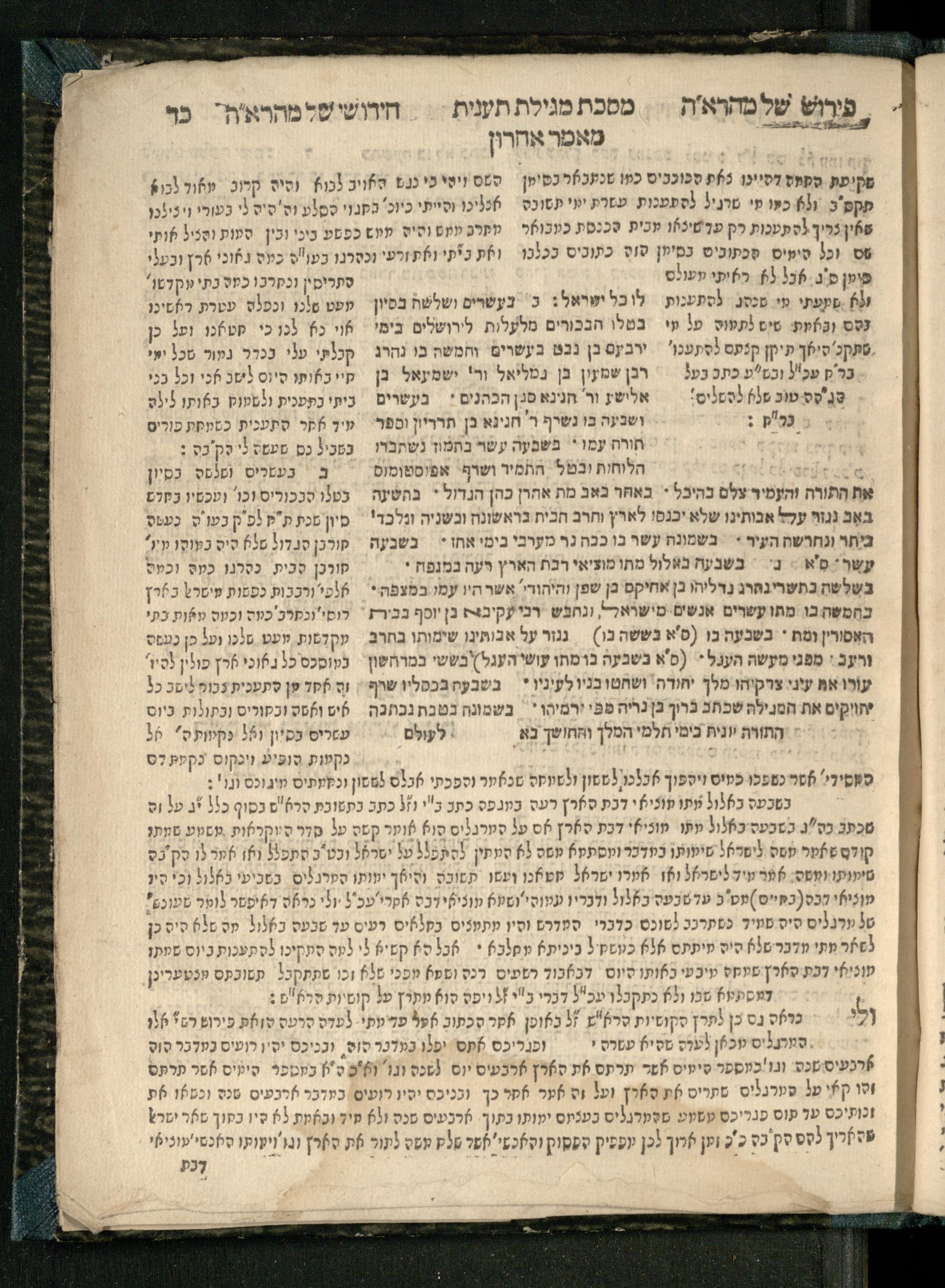 Masekhet Megilat Taʿanit : reʾeh zeh ḥadash asher lo hayah le-ʿolami masekhet zo ʿim perush maspiḳ she-nilḳaṭ min sugyot u-masḳanot Talmud Bavli ṿe-Talmud Yerushalmi, min Rashi ṿe-Tosafo. u-lifʿamim me-ḥadesh ha-meḥaber perush ... ṿe-niḳra shemo Perush kolel shel Maharʾah ʿal shem she-kolel kol ha-perushim Perush Rashi ṿe-Tosafot ... gam perush ʿal ha-Milo. zarot a.p. sefer ha-neḥmad ʿArukh ḥadash ṿe-hemah mi-tsad a. shel zeh ha-sefer u-mi-tsad ha-b. ḥidushe ha-meḥaber ... Ṿe-niḳraʾim Ḥidushe Maharah ʿal shemo ... Avraham ha-Leṿi ben ... Yosef Segal ... ben ... Avraham Perets Segal ... mi-ḳ.ḳ Ḳraḳa ...מסכת מגילת תענית : ראה זה חדש אשר לא היה לעולמי׳ מסכת זו עם פירוש מספיק שנילקט מן סוגיות ומסקנות תלמוד בבלי ותלמוד ירושלמי, מן רש״י ותוספו׳ ולפעמים מחדש המחבר פירוש ... ונקרא שמו פירוש כולל של מהרא״ה על שם שכולל כל הפירושים פירוש רש״י ותוספות ... גם פירוש על המלו׳ זרות ע״פ ספר הנחמד ערוך חדש והמה מצד א׳ של זה ספר ומצד הב׳ חידושי המחבר ... ונקראים חידושי מהרא״ה על שמו ... אברהם הלוי בן ... יוסף סג״ל ... בן ... אברהם פרץ סג״ל ... מק״ק קראקא
