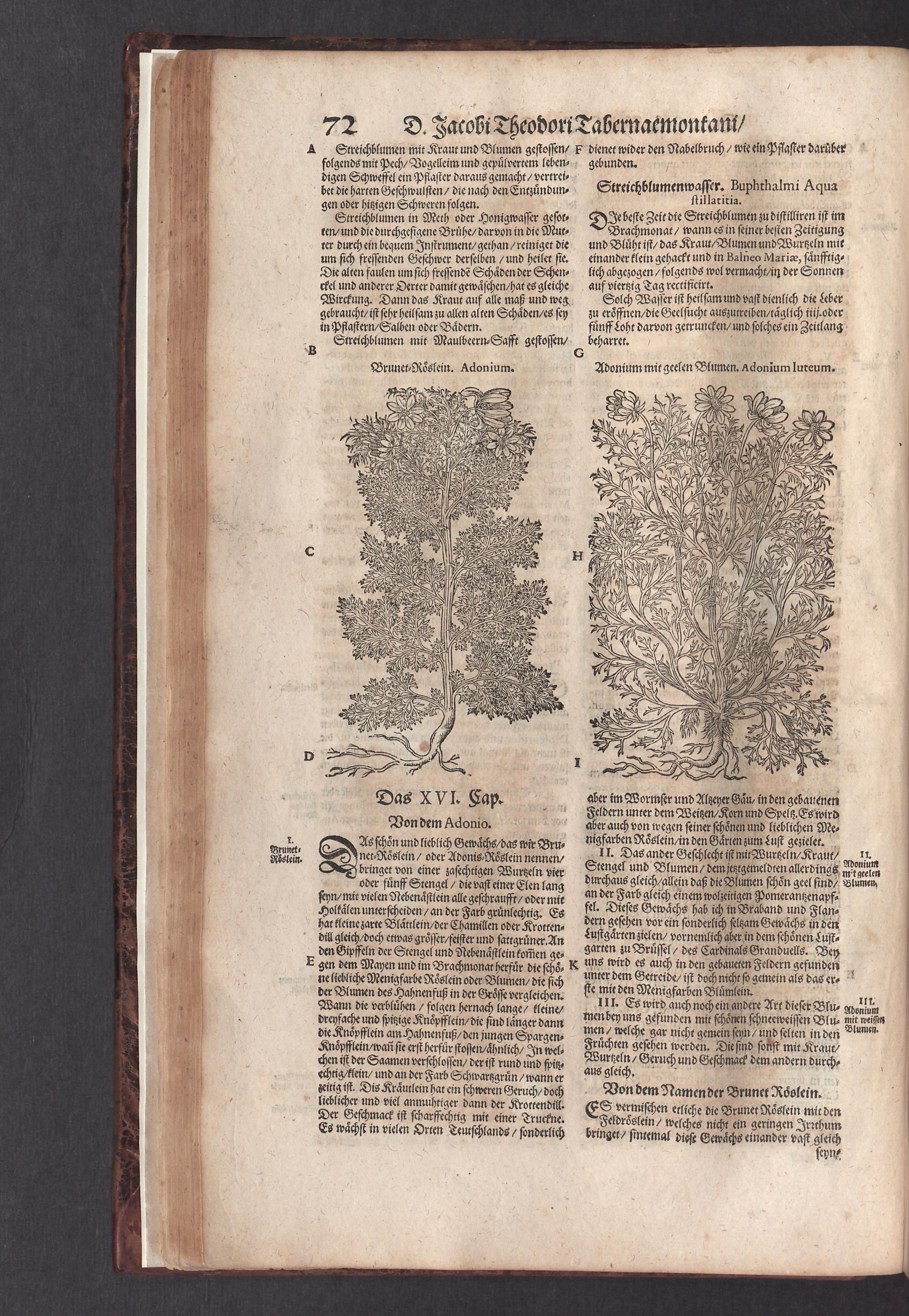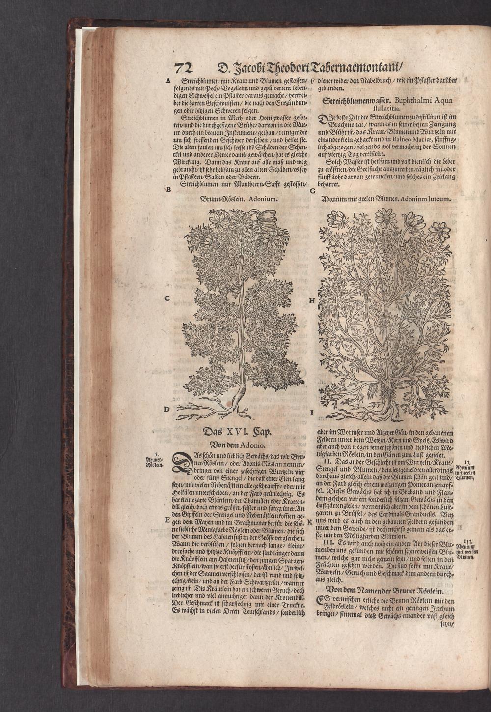 D. Jacobi Theodori Tabernaemontani, Neu vollkommen Kräuter-Buch : Darinnen Uber 3000. Kräuter/ mit schönen und kunstlichen Figuren/ auch deren Underscheid und Würckung/ samt ihren Namen in mancherley Sprachen/ beschrieben: Desgleichen auch/ wie dieselbige in allerhand Kranckheiten/ beyde der Menschen und des Viehs/ sollen angewendet und gebraucht werden/ angezeigt wird. Erstlichen durch Casparum Bauhinum D. und Profess. Basil. mit vielen neuen Figuren/ nutzlichen Artzneyen/ und anderem/ mit sonderem Fleis gebesseret/ Zum Andern Durch Hieronymum Bauhinum D. und Profess. Basil. mit sehr nutzlichen Marginalien, Synonimis, neuen Registeren und anderem vermehrt