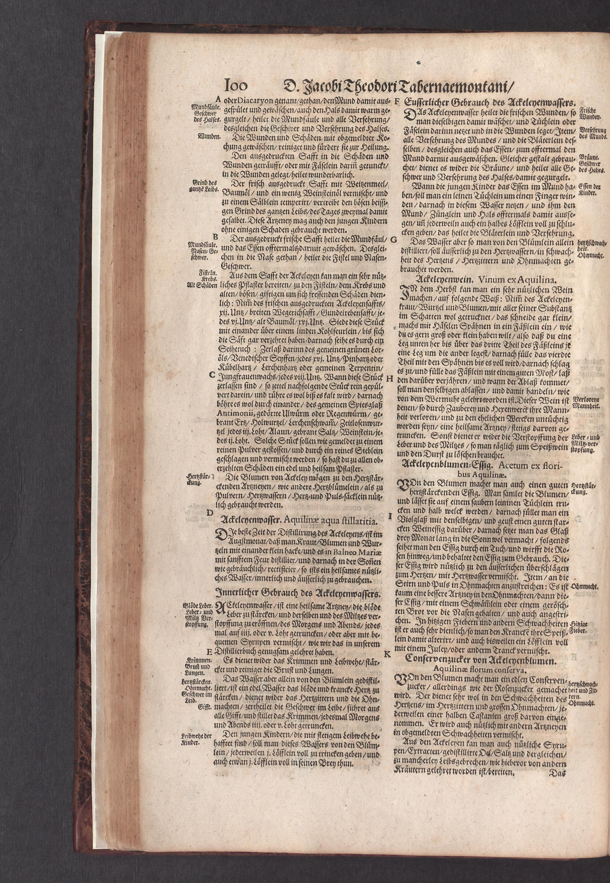 D. Jacobi Theodori Tabernaemontani, Neu vollkommen Kräuter-Buch : Darinnen Uber 3000. Kräuter/ mit schönen und kunstlichen Figuren/ auch deren Underscheid und Würckung/ samt ihren Namen in mancherley Sprachen/ beschrieben: Desgleichen auch/ wie dieselbige in allerhand Kranckheiten/ beyde der Menschen und des Viehs/ sollen angewendet und gebraucht werden/ angezeigt wird. Erstlichen durch Casparum Bauhinum D. und Profess. Basil. mit vielen neuen Figuren/ nutzlichen Artzneyen/ und anderem/ mit sonderem Fleis gebesseret/ Zum Andern Durch Hieronymum Bauhinum D. und Profess. Basil. mit sehr nutzlichen Marginalien, Synonimis, neuen Registeren und anderem vermehrt