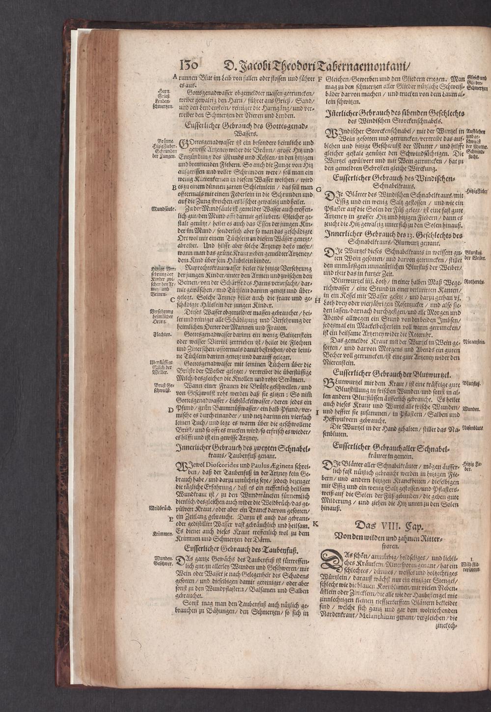 D. Jacobi Theodori Tabernaemontani, Neu vollkommen Kräuter-Buch : Darinnen Uber 3000. Kräuter/ mit schönen und kunstlichen Figuren/ auch deren Underscheid und Würckung/ samt ihren Namen in mancherley Sprachen/ beschrieben: Desgleichen auch/ wie dieselbige in allerhand Kranckheiten/ beyde der Menschen und des Viehs/ sollen angewendet und gebraucht werden/ angezeigt wird. Erstlichen durch Casparum Bauhinum D. und Profess. Basil. mit vielen neuen Figuren/ nutzlichen Artzneyen/ und anderem/ mit sonderem Fleis gebesseret/ Zum Andern Durch Hieronymum Bauhinum D. und Profess. Basil. mit sehr nutzlichen Marginalien, Synonimis, neuen Registeren und anderem vermehrt