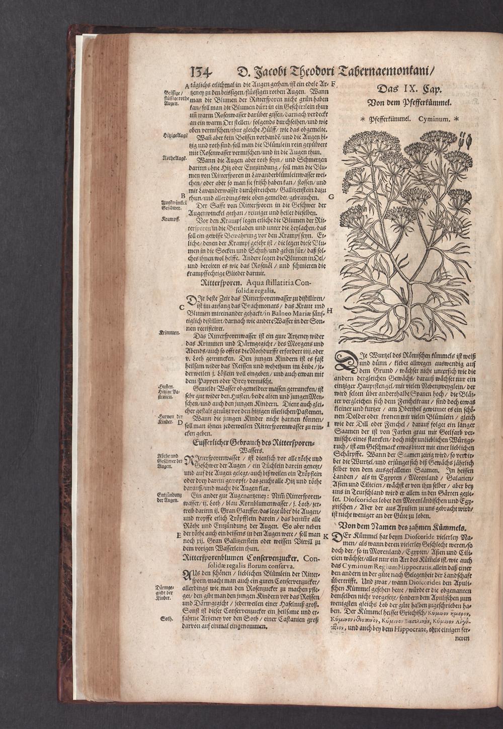 D. Jacobi Theodori Tabernaemontani, Neu vollkommen Kräuter-Buch : Darinnen Uber 3000. Kräuter/ mit schönen und kunstlichen Figuren/ auch deren Underscheid und Würckung/ samt ihren Namen in mancherley Sprachen/ beschrieben: Desgleichen auch/ wie dieselbige in allerhand Kranckheiten/ beyde der Menschen und des Viehs/ sollen angewendet und gebraucht werden/ angezeigt wird. Erstlichen durch Casparum Bauhinum D. und Profess. Basil. mit vielen neuen Figuren/ nutzlichen Artzneyen/ und anderem/ mit sonderem Fleis gebesseret/ Zum Andern Durch Hieronymum Bauhinum D. und Profess. Basil. mit sehr nutzlichen Marginalien, Synonimis, neuen Registeren und anderem vermehrt