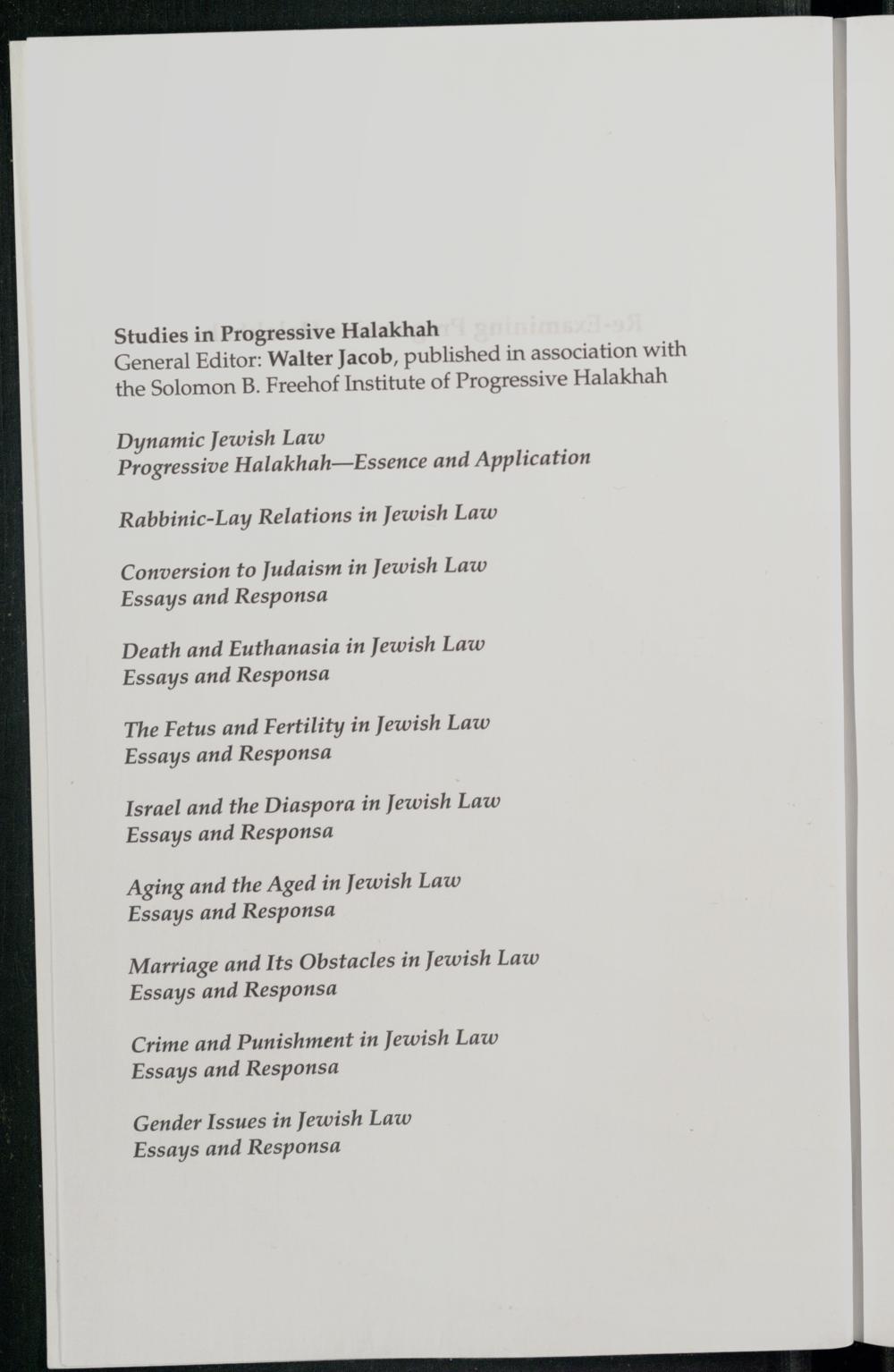 Re-examining progressive halakhah / edited by Walter Jacob and Moshe Zemer