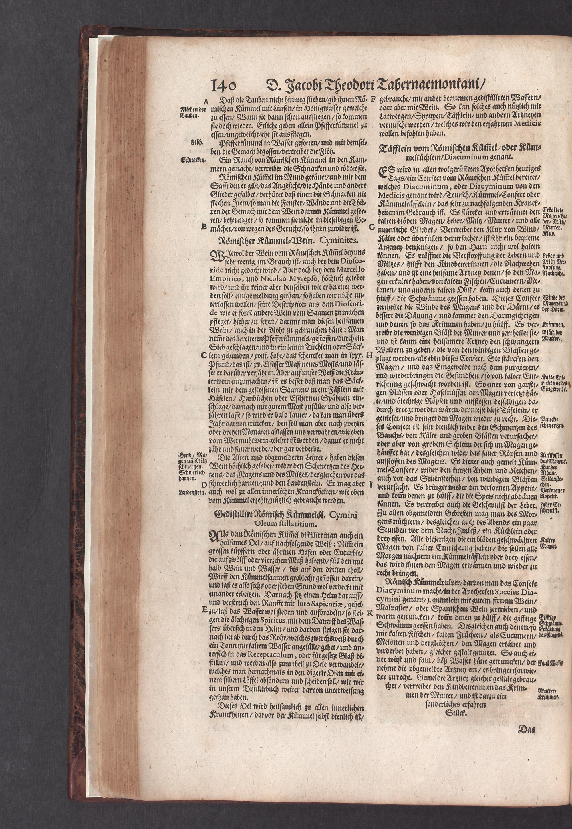 D. Jacobi Theodori Tabernaemontani, Neu vollkommen Kräuter-Buch : Darinnen Uber 3000. Kräuter/ mit schönen und kunstlichen Figuren/ auch deren Underscheid und Würckung/ samt ihren Namen in mancherley Sprachen/ beschrieben: Desgleichen auch/ wie dieselbige in allerhand Kranckheiten/ beyde der Menschen und des Viehs/ sollen angewendet und gebraucht werden/ angezeigt wird. Erstlichen durch Casparum Bauhinum D. und Profess. Basil. mit vielen neuen Figuren/ nutzlichen Artzneyen/ und anderem/ mit sonderem Fleis gebesseret/ Zum Andern Durch Hieronymum Bauhinum D. und Profess. Basil. mit sehr nutzlichen Marginalien, Synonimis, neuen Registeren und anderem vermehrt