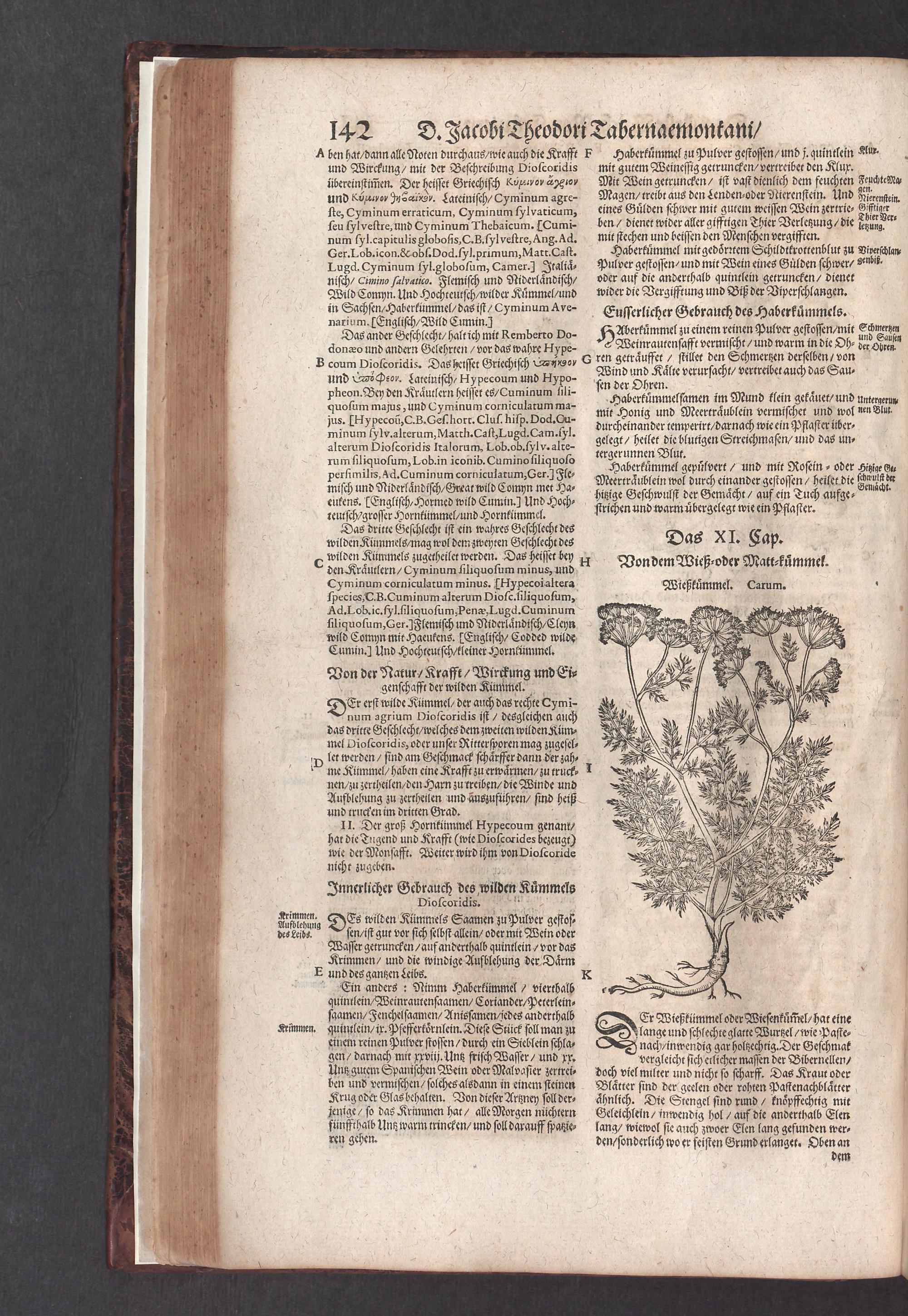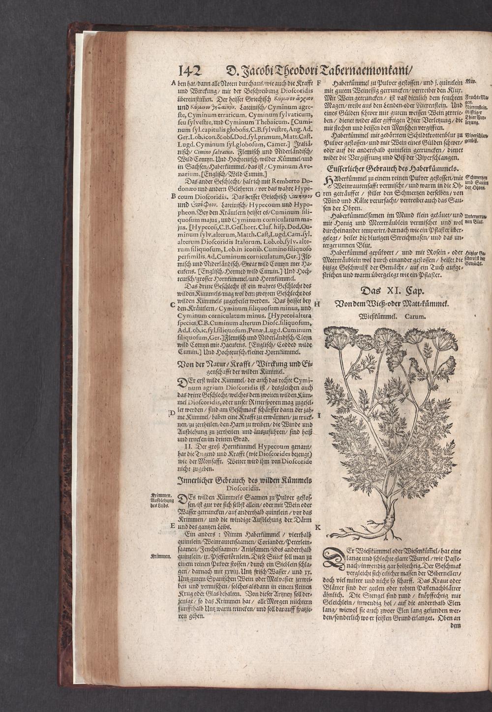 D. Jacobi Theodori Tabernaemontani, Neu vollkommen Kräuter-Buch : Darinnen Uber 3000. Kräuter/ mit schönen und kunstlichen Figuren/ auch deren Underscheid und Würckung/ samt ihren Namen in mancherley Sprachen/ beschrieben: Desgleichen auch/ wie dieselbige in allerhand Kranckheiten/ beyde der Menschen und des Viehs/ sollen angewendet und gebraucht werden/ angezeigt wird. Erstlichen durch Casparum Bauhinum D. und Profess. Basil. mit vielen neuen Figuren/ nutzlichen Artzneyen/ und anderem/ mit sonderem Fleis gebesseret/ Zum Andern Durch Hieronymum Bauhinum D. und Profess. Basil. mit sehr nutzlichen Marginalien, Synonimis, neuen Registeren und anderem vermehrt