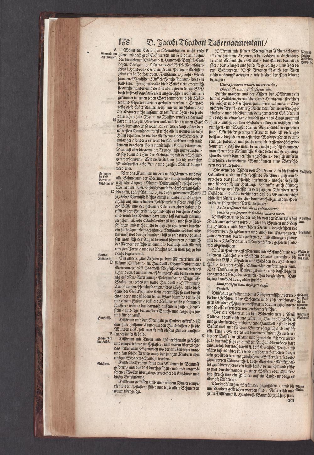 D. Jacobi Theodori Tabernaemontani, Neu vollkommen Kräuter-Buch : Darinnen Uber 3000. Kräuter/ mit schönen und kunstlichen Figuren/ auch deren Underscheid und Würckung/ samt ihren Namen in mancherley Sprachen/ beschrieben: Desgleichen auch/ wie dieselbige in allerhand Kranckheiten/ beyde der Menschen und des Viehs/ sollen angewendet und gebraucht werden/ angezeigt wird. Erstlichen durch Casparum Bauhinum D. und Profess. Basil. mit vielen neuen Figuren/ nutzlichen Artzneyen/ und anderem/ mit sonderem Fleis gebesseret/ Zum Andern Durch Hieronymum Bauhinum D. und Profess. Basil. mit sehr nutzlichen Marginalien, Synonimis, neuen Registeren und anderem vermehrt