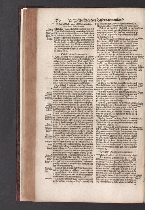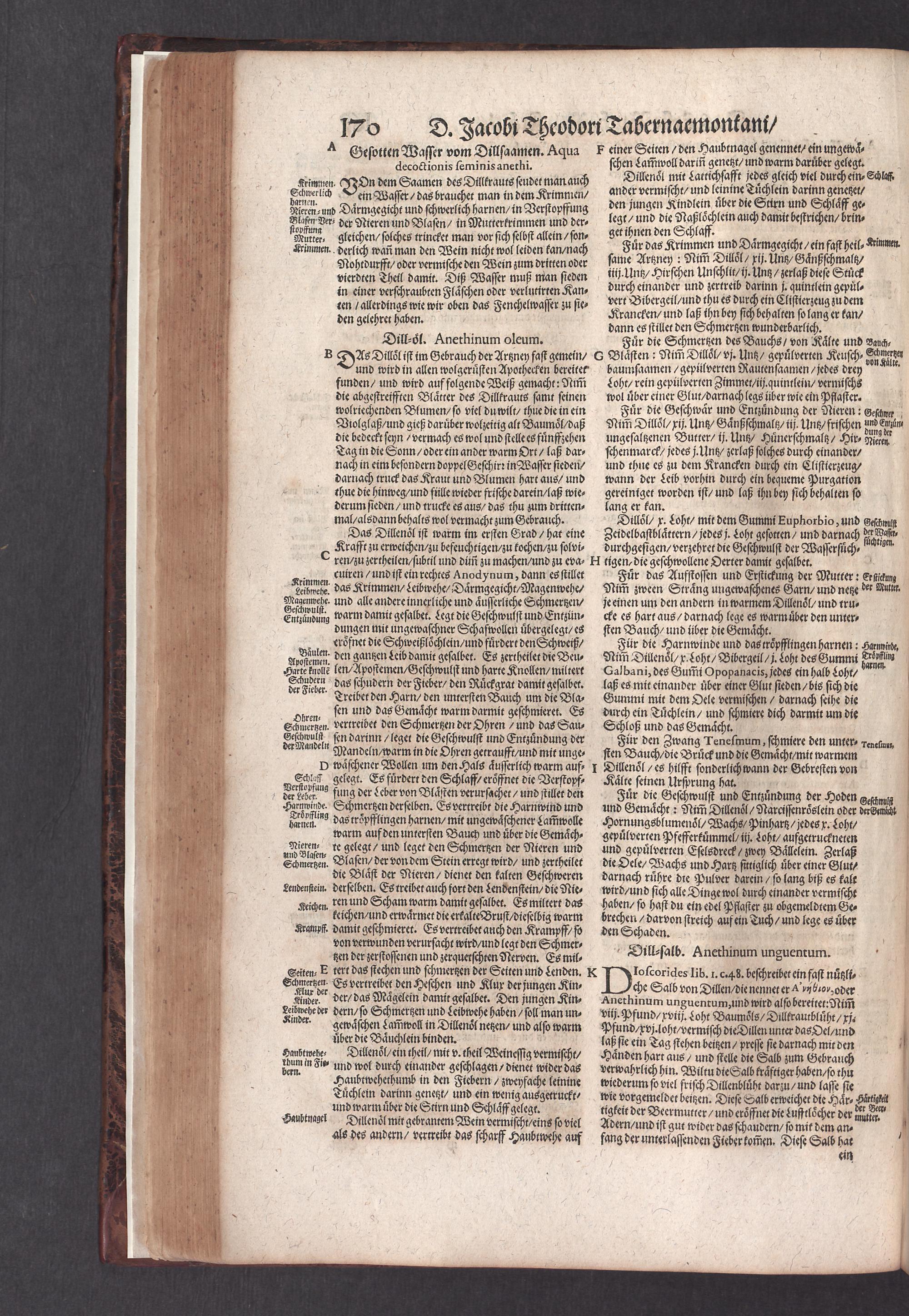 D. Jacobi Theodori Tabernaemontani, Neu vollkommen Kräuter-Buch : Darinnen Uber 3000. Kräuter/ mit schönen und kunstlichen Figuren/ auch deren Underscheid und Würckung/ samt ihren Namen in mancherley Sprachen/ beschrieben: Desgleichen auch/ wie dieselbige in allerhand Kranckheiten/ beyde der Menschen und des Viehs/ sollen angewendet und gebraucht werden/ angezeigt wird. Erstlichen durch Casparum Bauhinum D. und Profess. Basil. mit vielen neuen Figuren/ nutzlichen Artzneyen/ und anderem/ mit sonderem Fleis gebesseret/ Zum Andern Durch Hieronymum Bauhinum D. und Profess. Basil. mit sehr nutzlichen Marginalien, Synonimis, neuen Registeren und anderem vermehrt