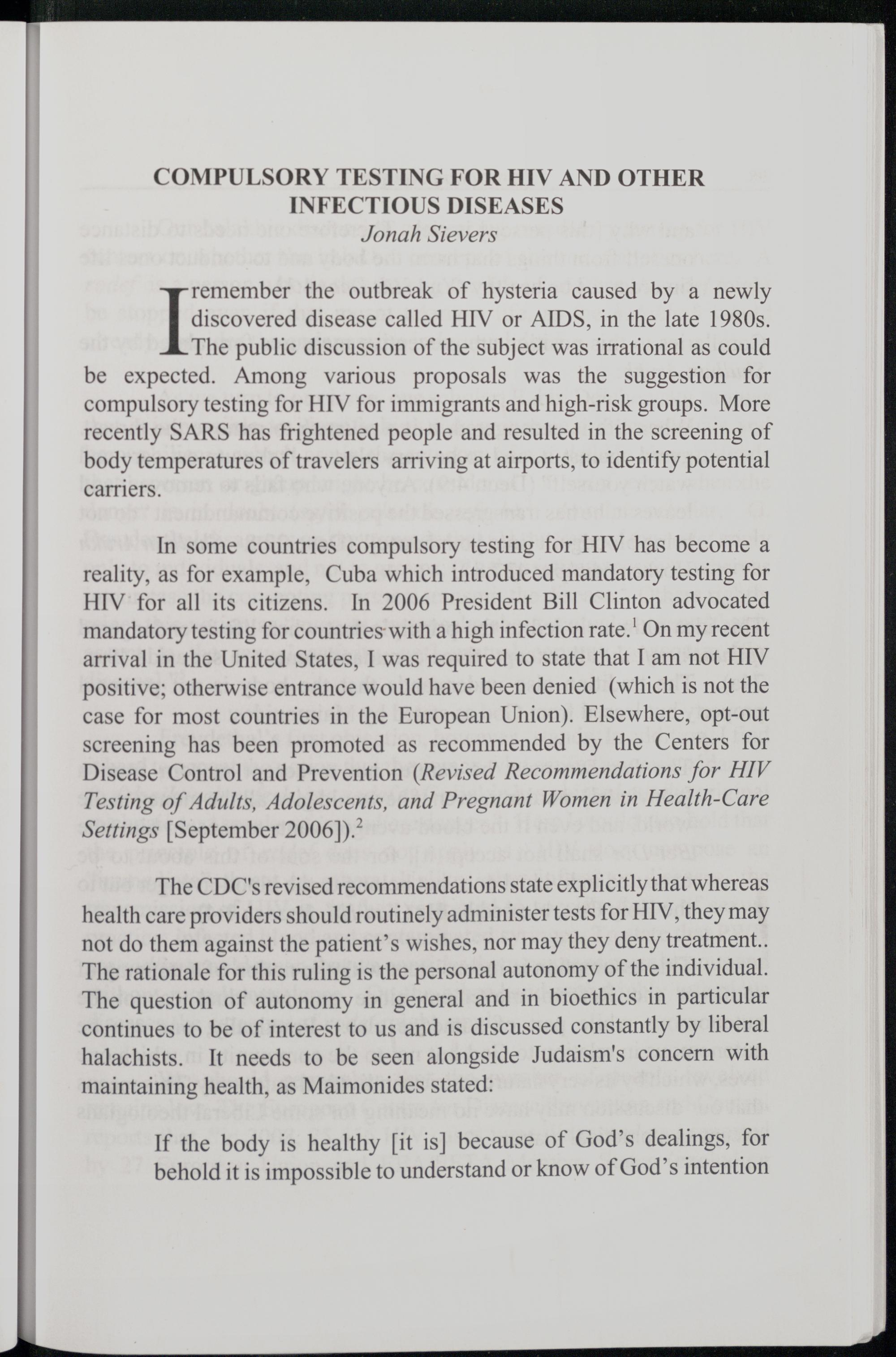 COMPULSORY TESTING FOR HIV AND OTHER INFECTIOUS DISEASES