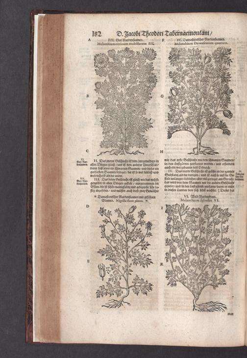 D. Jacobi Theodori Tabernaemontani, Neu vollkommen Kräuter-Buch : Darinnen Uber 3000. Kräuter/ mit schönen und kunstlichen Figuren/ auch deren Underscheid und Würckung/ samt ihren Namen in mancherley Sprachen/ beschrieben: Desgleichen auch/ wie dieselbige in allerhand Kranckheiten/ beyde der Menschen und des Viehs/ sollen angewendet und gebraucht werden/ angezeigt wird. Erstlichen durch Casparum Bauhinum D. und Profess. Basil. mit vielen neuen Figuren/ nutzlichen Artzneyen/ und anderem/ mit sonderem Fleis gebesseret/ Zum Andern Durch Hieronymum Bauhinum D. und Profess. Basil. mit sehr nutzlichen Marginalien, Synonimis, neuen Registeren und anderem vermehrt