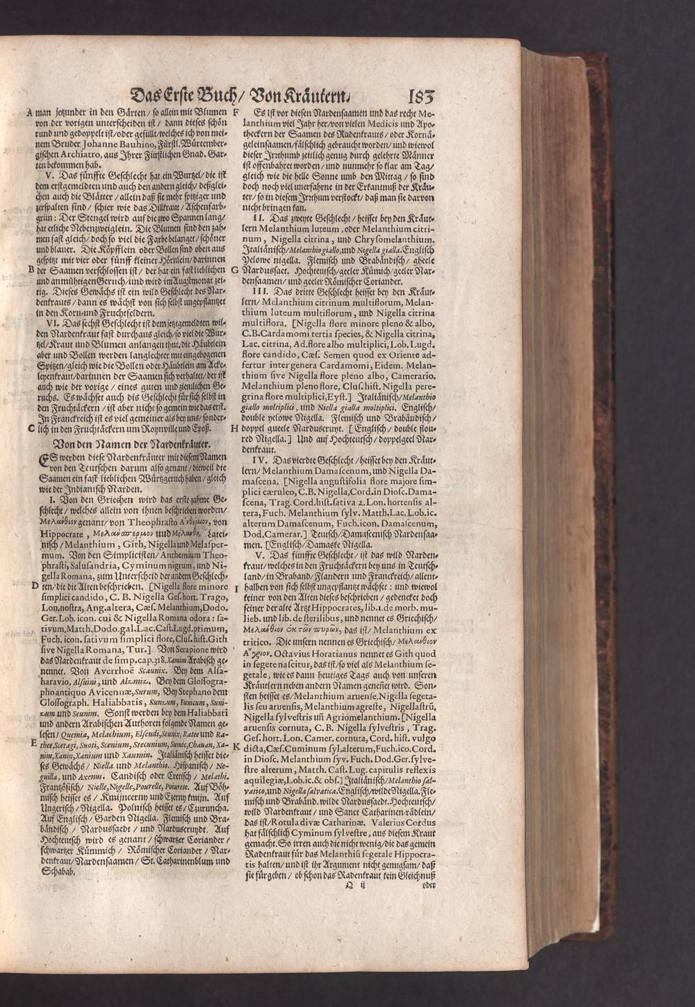 D. Jacobi Theodori Tabernaemontani, Neu vollkommen Kräuter-Buch : Darinnen Uber 3000. Kräuter/ mit schönen und kunstlichen Figuren/ auch deren Underscheid und Würckung/ samt ihren Namen in mancherley Sprachen/ beschrieben: Desgleichen auch/ wie dieselbige in allerhand Kranckheiten/ beyde der Menschen und des Viehs/ sollen angewendet und gebraucht werden/ angezeigt wird. Erstlichen durch Casparum Bauhinum D. und Profess. Basil. mit vielen neuen Figuren/ nutzlichen Artzneyen/ und anderem/ mit sonderem Fleis gebesseret/ Zum Andern Durch Hieronymum Bauhinum D. und Profess. Basil. mit sehr nutzlichen Marginalien, Synonimis, neuen Registeren und anderem vermehrt