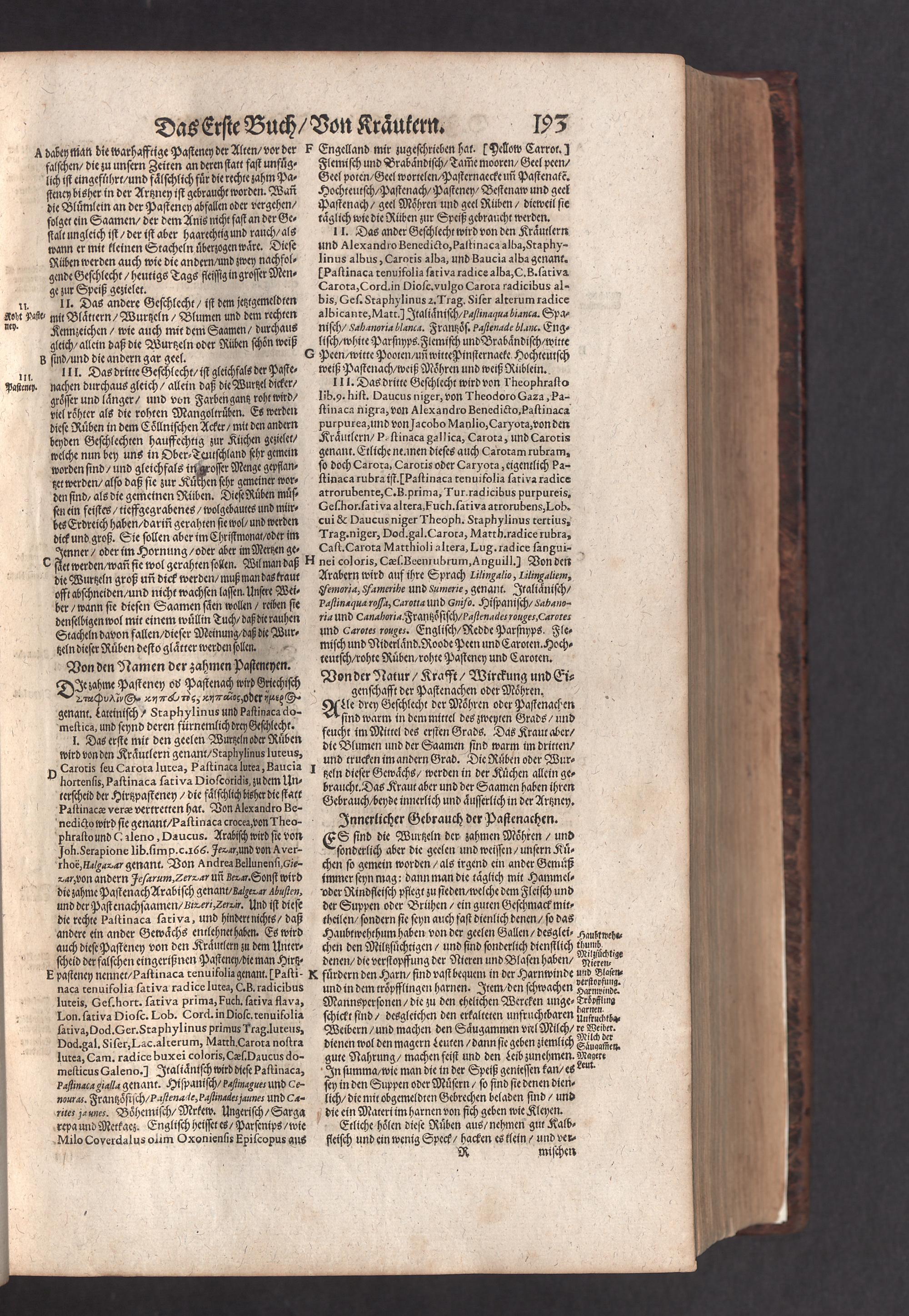 D. Jacobi Theodori Tabernaemontani, Neu vollkommen Kräuter-Buch : Darinnen Uber 3000. Kräuter/ mit schönen und kunstlichen Figuren/ auch deren Underscheid und Würckung/ samt ihren Namen in mancherley Sprachen/ beschrieben: Desgleichen auch/ wie dieselbige in allerhand Kranckheiten/ beyde der Menschen und des Viehs/ sollen angewendet und gebraucht werden/ angezeigt wird. Erstlichen durch Casparum Bauhinum D. und Profess. Basil. mit vielen neuen Figuren/ nutzlichen Artzneyen/ und anderem/ mit sonderem Fleis gebesseret/ Zum Andern Durch Hieronymum Bauhinum D. und Profess. Basil. mit sehr nutzlichen Marginalien, Synonimis, neuen Registeren und anderem vermehrt