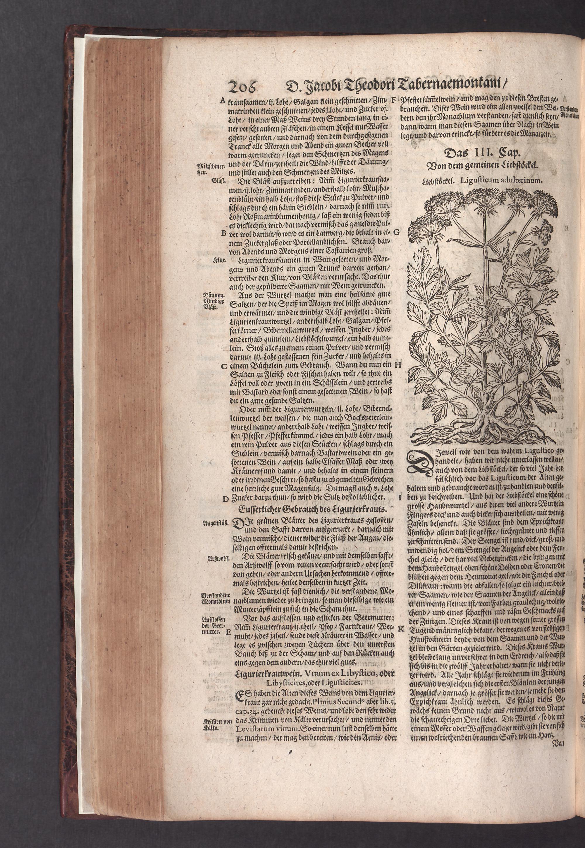 D. Jacobi Theodori Tabernaemontani, Neu vollkommen Kräuter-Buch : Darinnen Uber 3000. Kräuter/ mit schönen und kunstlichen Figuren/ auch deren Underscheid und Würckung/ samt ihren Namen in mancherley Sprachen/ beschrieben: Desgleichen auch/ wie dieselbige in allerhand Kranckheiten/ beyde der Menschen und des Viehs/ sollen angewendet und gebraucht werden/ angezeigt wird. Erstlichen durch Casparum Bauhinum D. und Profess. Basil. mit vielen neuen Figuren/ nutzlichen Artzneyen/ und anderem/ mit sonderem Fleis gebesseret/ Zum Andern Durch Hieronymum Bauhinum D. und Profess. Basil. mit sehr nutzlichen Marginalien, Synonimis, neuen Registeren und anderem vermehrt