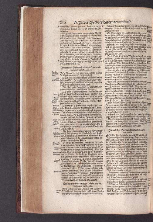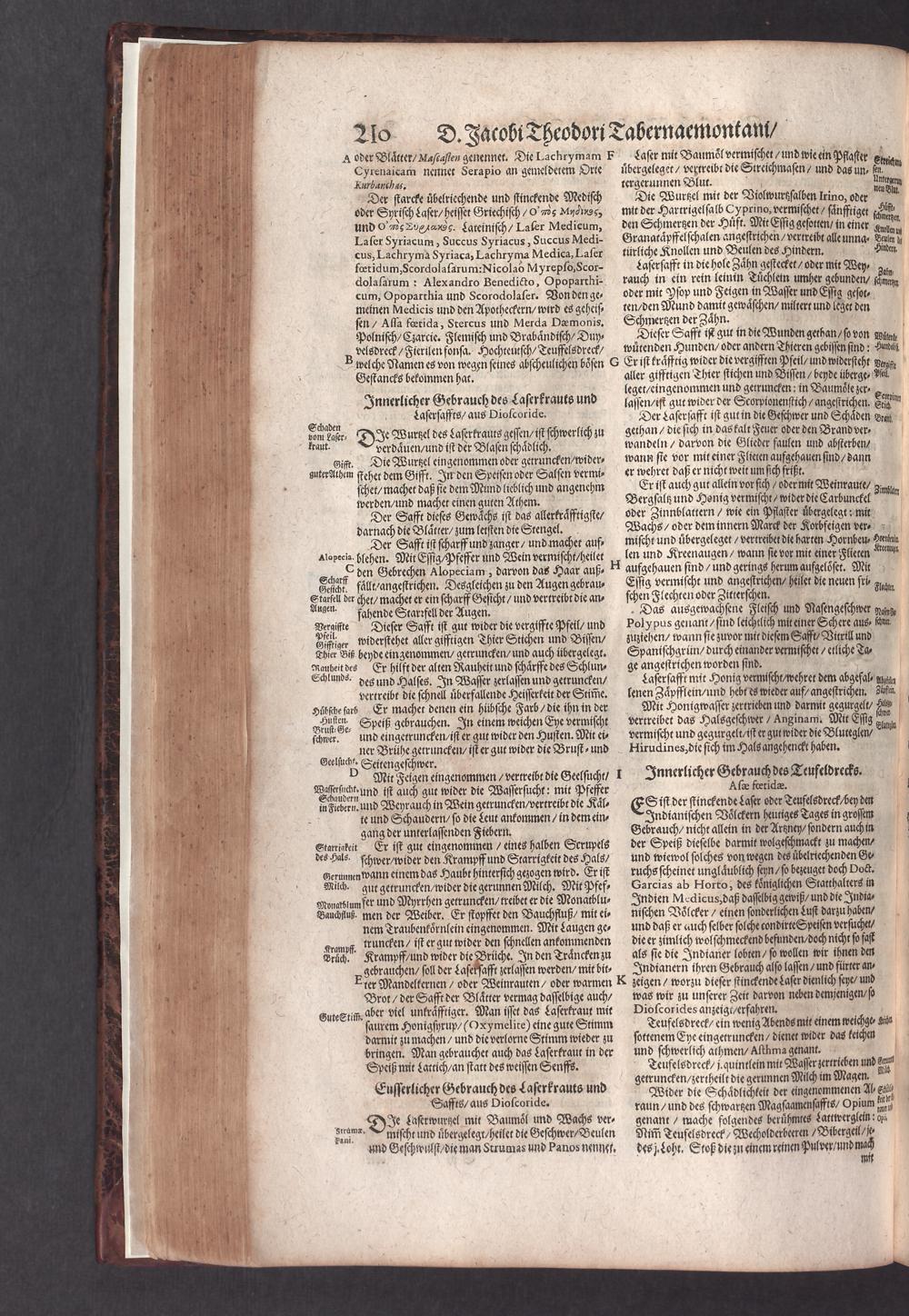 D. Jacobi Theodori Tabernaemontani, Neu vollkommen Kräuter-Buch : Darinnen Uber 3000. Kräuter/ mit schönen und kunstlichen Figuren/ auch deren Underscheid und Würckung/ samt ihren Namen in mancherley Sprachen/ beschrieben: Desgleichen auch/ wie dieselbige in allerhand Kranckheiten/ beyde der Menschen und des Viehs/ sollen angewendet und gebraucht werden/ angezeigt wird. Erstlichen durch Casparum Bauhinum D. und Profess. Basil. mit vielen neuen Figuren/ nutzlichen Artzneyen/ und anderem/ mit sonderem Fleis gebesseret/ Zum Andern Durch Hieronymum Bauhinum D. und Profess. Basil. mit sehr nutzlichen Marginalien, Synonimis, neuen Registeren und anderem vermehrt