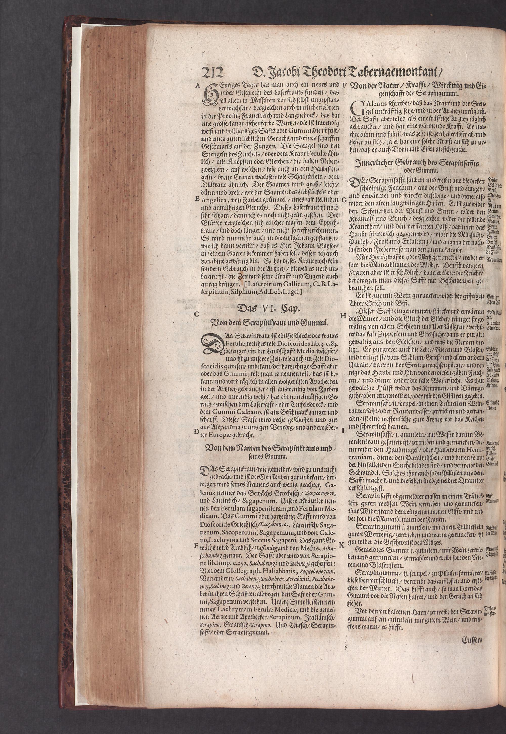 D. Jacobi Theodori Tabernaemontani, Neu vollkommen Kräuter-Buch : Darinnen Uber 3000. Kräuter/ mit schönen und kunstlichen Figuren/ auch deren Underscheid und Würckung/ samt ihren Namen in mancherley Sprachen/ beschrieben: Desgleichen auch/ wie dieselbige in allerhand Kranckheiten/ beyde der Menschen und des Viehs/ sollen angewendet und gebraucht werden/ angezeigt wird. Erstlichen durch Casparum Bauhinum D. und Profess. Basil. mit vielen neuen Figuren/ nutzlichen Artzneyen/ und anderem/ mit sonderem Fleis gebesseret/ Zum Andern Durch Hieronymum Bauhinum D. und Profess. Basil. mit sehr nutzlichen Marginalien, Synonimis, neuen Registeren und anderem vermehrt