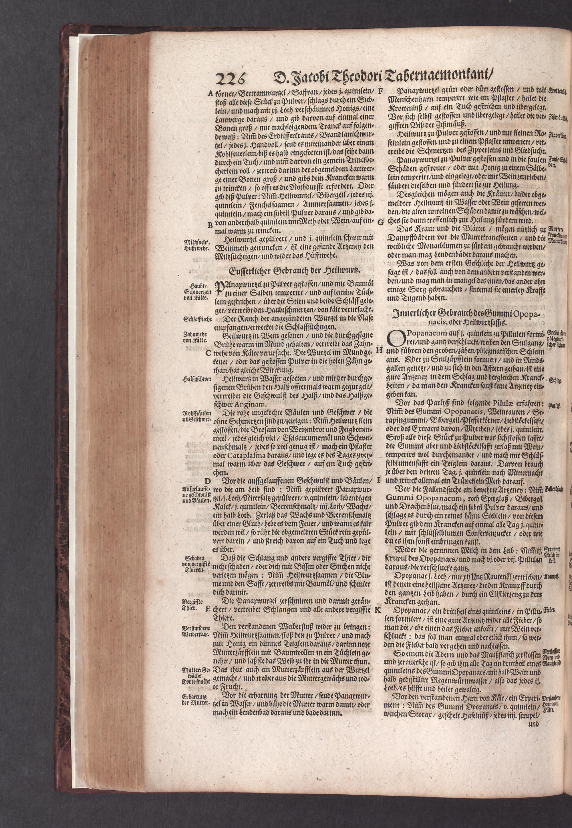 D. Jacobi Theodori Tabernaemontani, Neu vollkommen Kräuter-Buch : Darinnen Uber 3000. Kräuter/ mit schönen und kunstlichen Figuren/ auch deren Underscheid und Würckung/ samt ihren Namen in mancherley Sprachen/ beschrieben: Desgleichen auch/ wie dieselbige in allerhand Kranckheiten/ beyde der Menschen und des Viehs/ sollen angewendet und gebraucht werden/ angezeigt wird. Erstlichen durch Casparum Bauhinum D. und Profess. Basil. mit vielen neuen Figuren/ nutzlichen Artzneyen/ und anderem/ mit sonderem Fleis gebesseret/ Zum Andern Durch Hieronymum Bauhinum D. und Profess. Basil. mit sehr nutzlichen Marginalien, Synonimis, neuen Registeren und anderem vermehrt