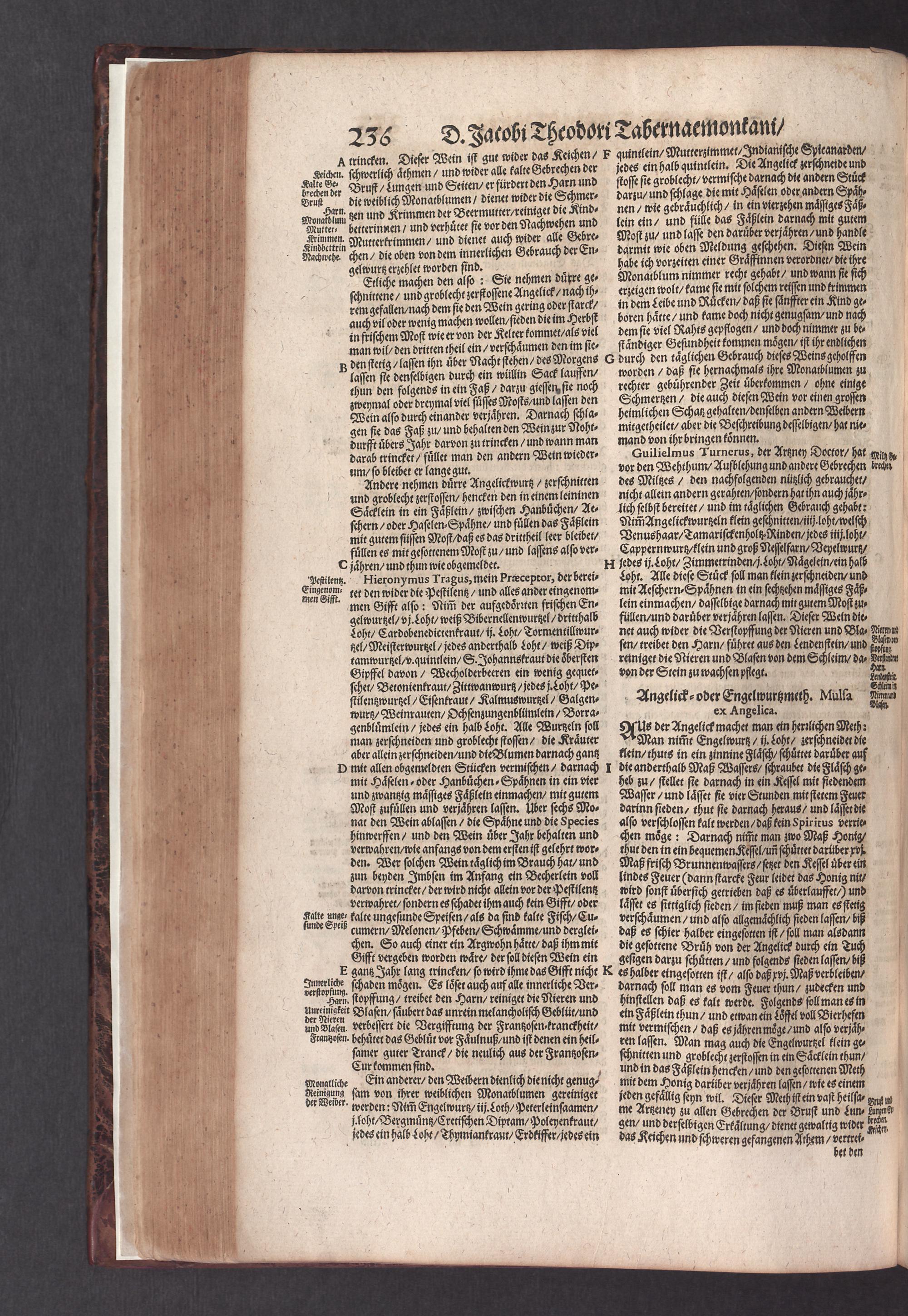 D. Jacobi Theodori Tabernaemontani, Neu vollkommen Kräuter-Buch : Darinnen Uber 3000. Kräuter/ mit schönen und kunstlichen Figuren/ auch deren Underscheid und Würckung/ samt ihren Namen in mancherley Sprachen/ beschrieben: Desgleichen auch/ wie dieselbige in allerhand Kranckheiten/ beyde der Menschen und des Viehs/ sollen angewendet und gebraucht werden/ angezeigt wird. Erstlichen durch Casparum Bauhinum D. und Profess. Basil. mit vielen neuen Figuren/ nutzlichen Artzneyen/ und anderem/ mit sonderem Fleis gebesseret/ Zum Andern Durch Hieronymum Bauhinum D. und Profess. Basil. mit sehr nutzlichen Marginalien, Synonimis, neuen Registeren und anderem vermehrt