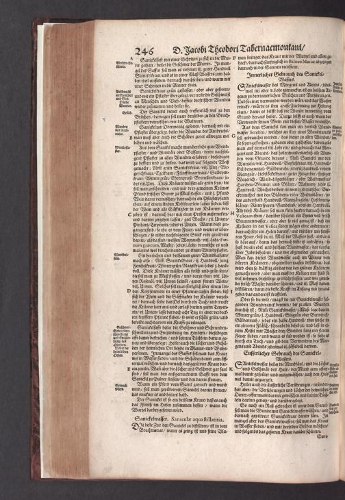 D. Jacobi Theodori Tabernaemontani, Neu vollkommen Kräuter-Buch : Darinnen Uber 3000. Kräuter/ mit schönen und kunstlichen Figuren/ auch deren Underscheid und Würckung/ samt ihren Namen in mancherley Sprachen/ beschrieben: Desgleichen auch/ wie dieselbige in allerhand Kranckheiten/ beyde der Menschen und des Viehs/ sollen angewendet und gebraucht werden/ angezeigt wird. Erstlichen durch Casparum Bauhinum D. und Profess. Basil. mit vielen neuen Figuren/ nutzlichen Artzneyen/ und anderem/ mit sonderem Fleis gebesseret/ Zum Andern Durch Hieronymum Bauhinum D. und Profess. Basil. mit sehr nutzlichen Marginalien, Synonimis, neuen Registeren und anderem vermehrt