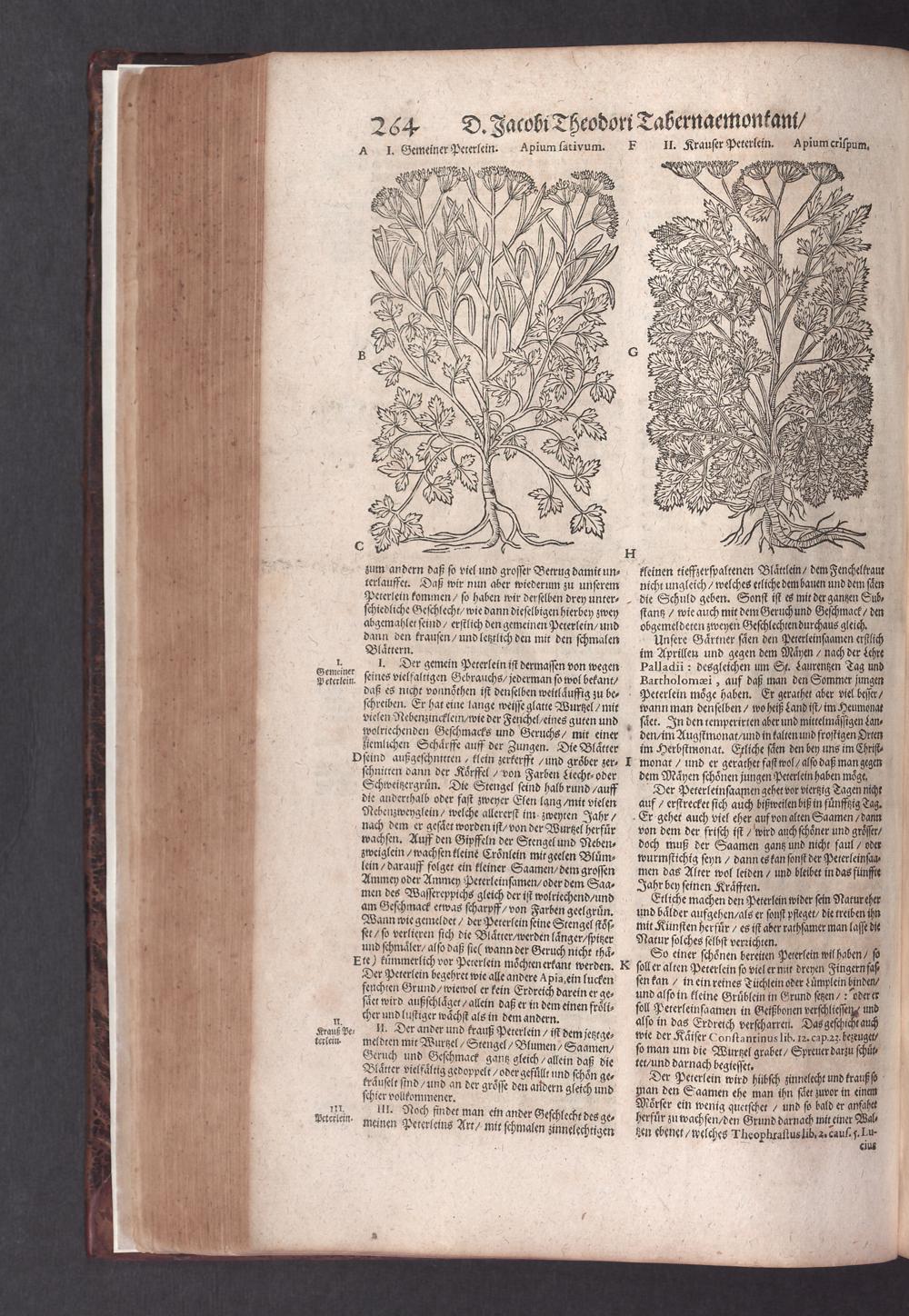D. Jacobi Theodori Tabernaemontani, Neu vollkommen Kräuter-Buch : Darinnen Uber 3000. Kräuter/ mit schönen und kunstlichen Figuren/ auch deren Underscheid und Würckung/ samt ihren Namen in mancherley Sprachen/ beschrieben: Desgleichen auch/ wie dieselbige in allerhand Kranckheiten/ beyde der Menschen und des Viehs/ sollen angewendet und gebraucht werden/ angezeigt wird. Erstlichen durch Casparum Bauhinum D. und Profess. Basil. mit vielen neuen Figuren/ nutzlichen Artzneyen/ und anderem/ mit sonderem Fleis gebesseret/ Zum Andern Durch Hieronymum Bauhinum D. und Profess. Basil. mit sehr nutzlichen Marginalien, Synonimis, neuen Registeren und anderem vermehrt