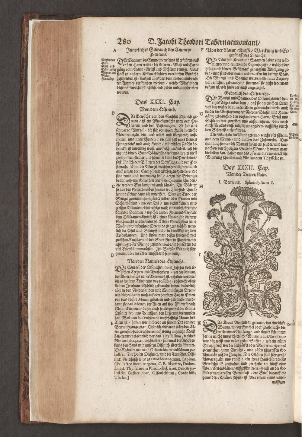 D. Jacobi Theodori Tabernaemontani, Neu vollkommen Kräuter-Buch : Darinnen Uber 3000. Kräuter/ mit schönen und kunstlichen Figuren/ auch deren Underscheid und Würckung/ samt ihren Namen in mancherley Sprachen/ beschrieben: Desgleichen auch/ wie dieselbige in allerhand Kranckheiten/ beyde der Menschen und des Viehs/ sollen angewendet und gebraucht werden/ angezeigt wird. Erstlichen durch Casparum Bauhinum D. und Profess. Basil. mit vielen neuen Figuren/ nutzlichen Artzneyen/ und anderem/ mit sonderem Fleis gebesseret/ Zum Andern Durch Hieronymum Bauhinum D. und Profess. Basil. mit sehr nutzlichen Marginalien, Synonimis, neuen Registeren und anderem vermehrt