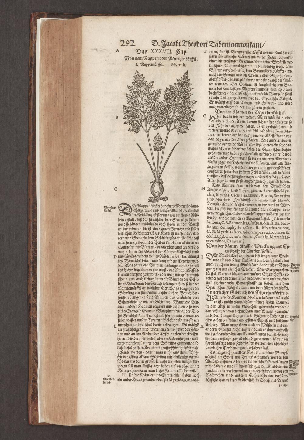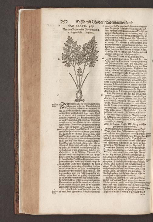 D. Jacobi Theodori Tabernaemontani, Neu vollkommen Kräuter-Buch : Darinnen Uber 3000. Kräuter/ mit schönen und kunstlichen Figuren/ auch deren Underscheid und Würckung/ samt ihren Namen in mancherley Sprachen/ beschrieben: Desgleichen auch/ wie dieselbige in allerhand Kranckheiten/ beyde der Menschen und des Viehs/ sollen angewendet und gebraucht werden/ angezeigt wird. Erstlichen durch Casparum Bauhinum D. und Profess. Basil. mit vielen neuen Figuren/ nutzlichen Artzneyen/ und anderem/ mit sonderem Fleis gebesseret/ Zum Andern Durch Hieronymum Bauhinum D. und Profess. Basil. mit sehr nutzlichen Marginalien, Synonimis, neuen Registeren und anderem vermehrt