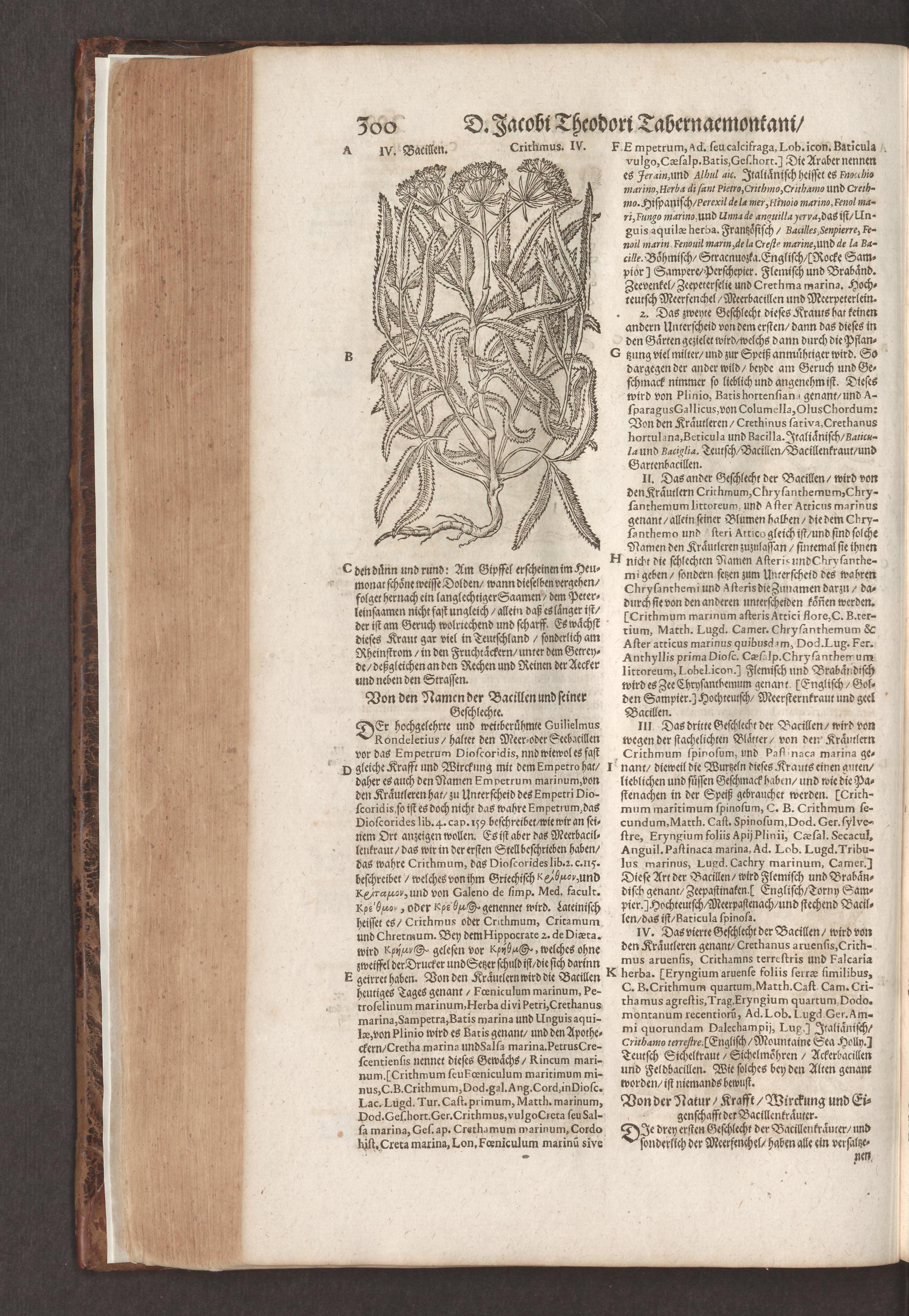 D. Jacobi Theodori Tabernaemontani, Neu vollkommen Kräuter-Buch : Darinnen Uber 3000. Kräuter/ mit schönen und kunstlichen Figuren/ auch deren Underscheid und Würckung/ samt ihren Namen in mancherley Sprachen/ beschrieben: Desgleichen auch/ wie dieselbige in allerhand Kranckheiten/ beyde der Menschen und des Viehs/ sollen angewendet und gebraucht werden/ angezeigt wird. Erstlichen durch Casparum Bauhinum D. und Profess. Basil. mit vielen neuen Figuren/ nutzlichen Artzneyen/ und anderem/ mit sonderem Fleis gebesseret/ Zum Andern Durch Hieronymum Bauhinum D. und Profess. Basil. mit sehr nutzlichen Marginalien, Synonimis, neuen Registeren und anderem vermehrt