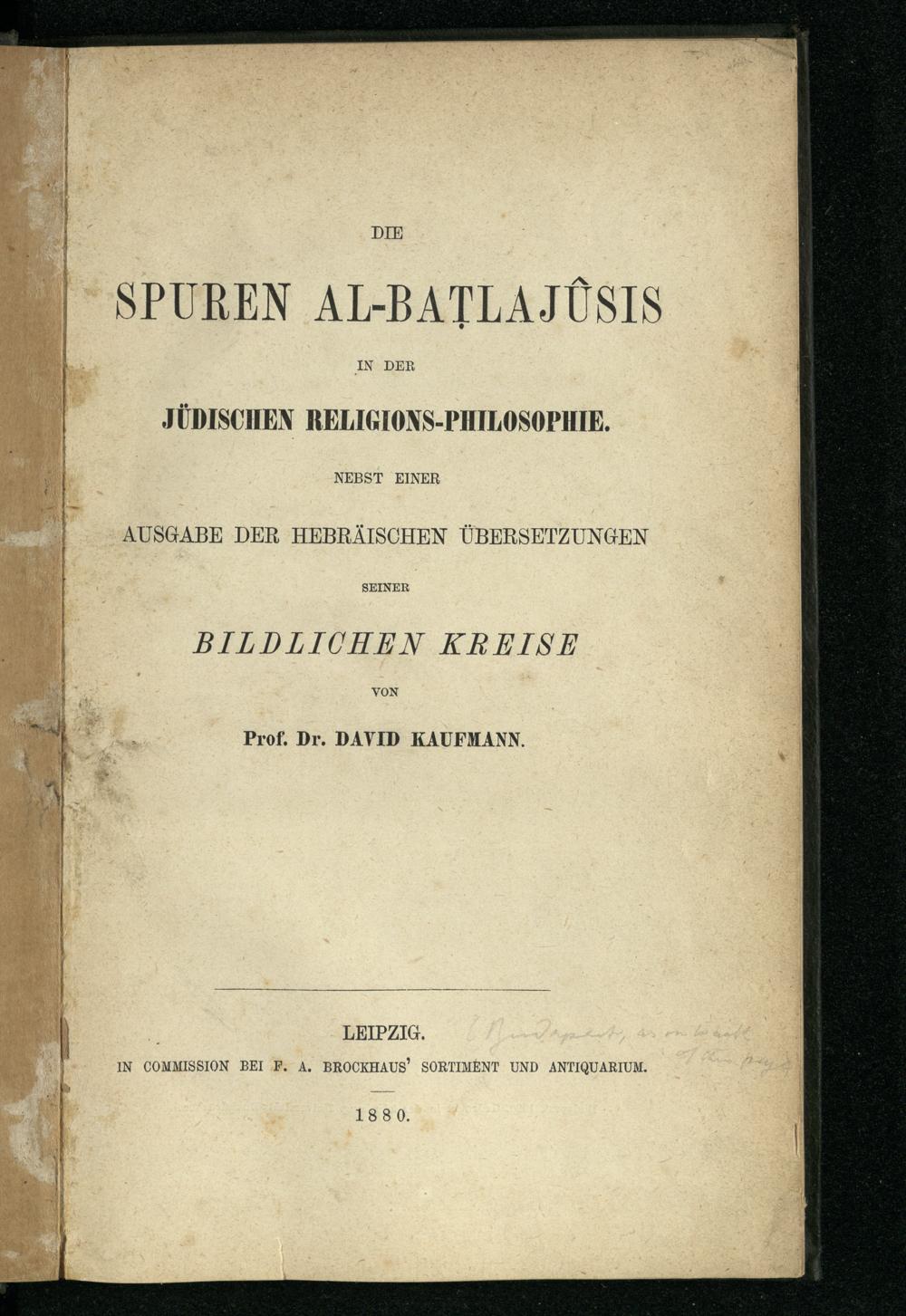 Die Spuren al-Baṭlajûsis in der jüdischen Religions-Philosophie nebst einer Ausgabe der hebräischen Übersetzungen seiner Bildlichen Kreise / von David Kaufmann
