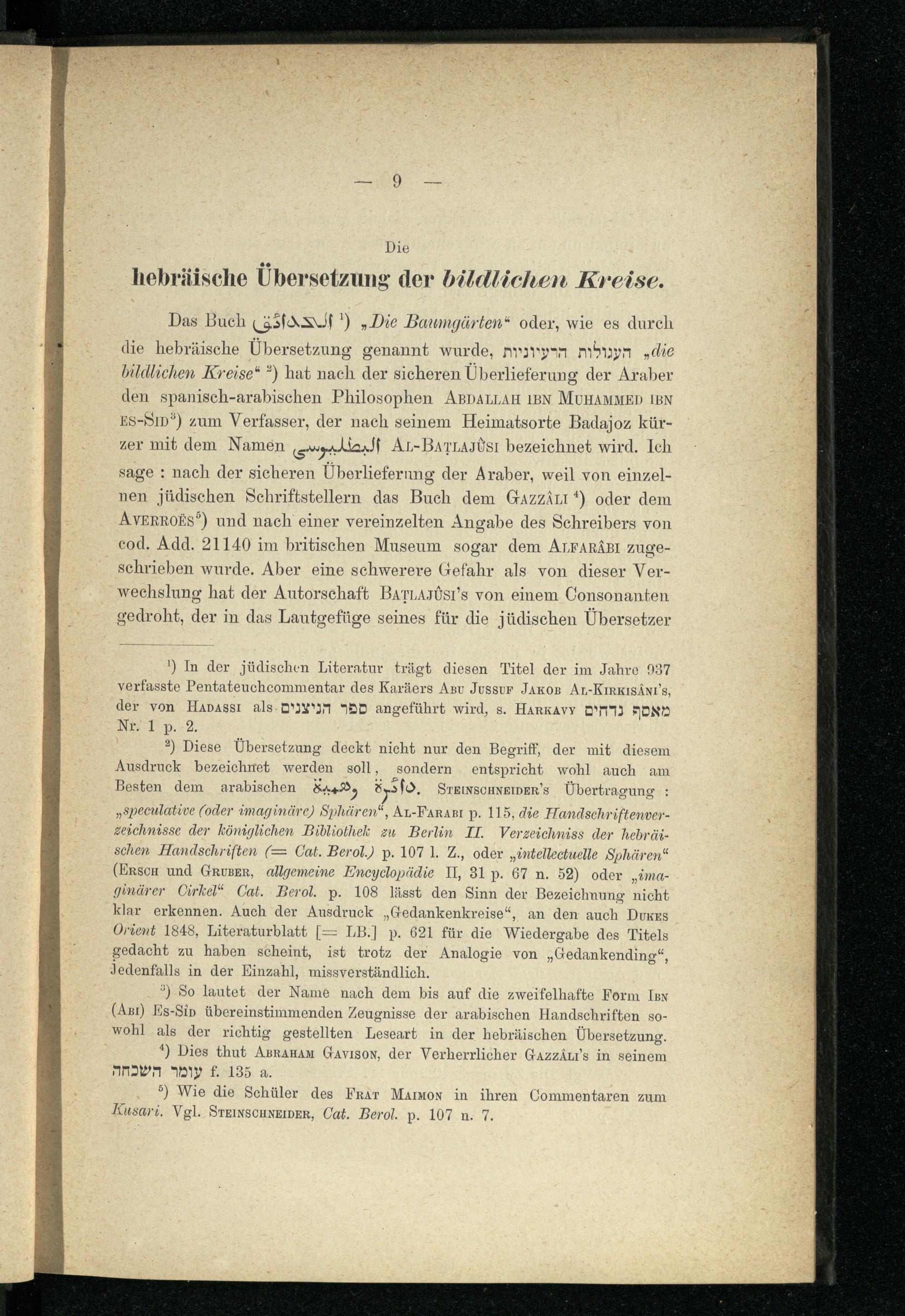 Die Spuren al-Baṭlajûsis in der jüdischen Religions-Philosophie nebst einer Ausgabe der hebräischen Übersetzungen seiner Bildlichen Kreise / von David Kaufmann