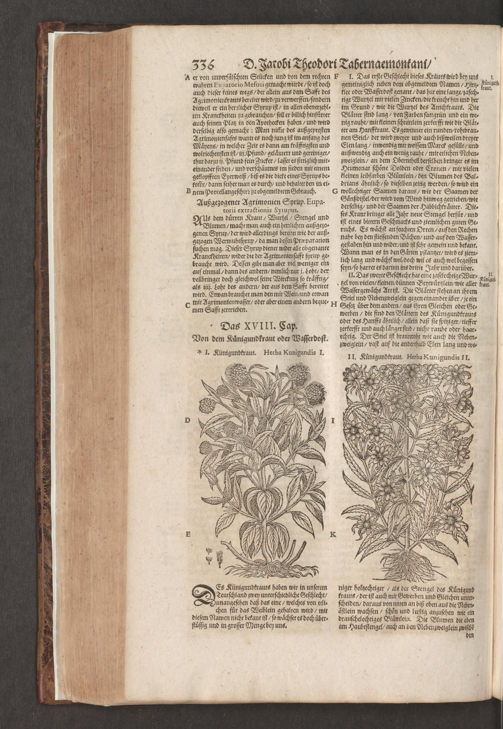 D. Jacobi Theodori Tabernaemontani, Neu vollkommen Kräuter-Buch : Darinnen Uber 3000. Kräuter/ mit schönen und kunstlichen Figuren/ auch deren Underscheid und Würckung/ samt ihren Namen in mancherley Sprachen/ beschrieben: Desgleichen auch/ wie dieselbige in allerhand Kranckheiten/ beyde der Menschen und des Viehs/ sollen angewendet und gebraucht werden/ angezeigt wird. Erstlichen durch Casparum Bauhinum D. und Profess. Basil. mit vielen neuen Figuren/ nutzlichen Artzneyen/ und anderem/ mit sonderem Fleis gebesseret/ Zum Andern Durch Hieronymum Bauhinum D. und Profess. Basil. mit sehr nutzlichen Marginalien, Synonimis, neuen Registeren und anderem vermehrt