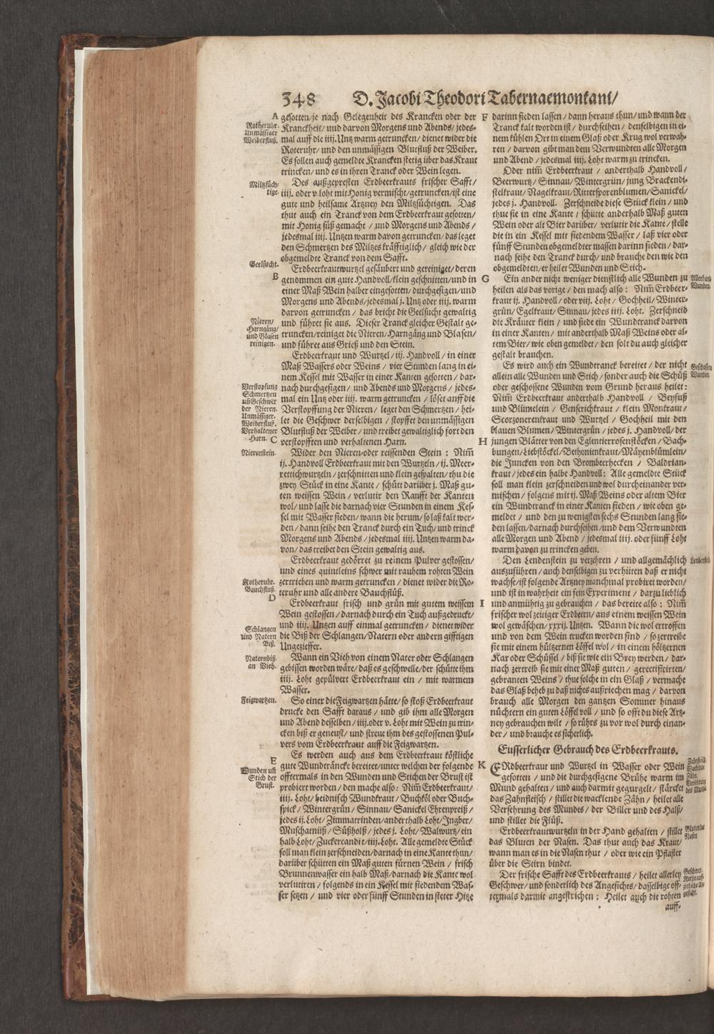 D. Jacobi Theodori Tabernaemontani, Neu vollkommen Kräuter-Buch : Darinnen Uber 3000. Kräuter/ mit schönen und kunstlichen Figuren/ auch deren Underscheid und Würckung/ samt ihren Namen in mancherley Sprachen/ beschrieben: Desgleichen auch/ wie dieselbige in allerhand Kranckheiten/ beyde der Menschen und des Viehs/ sollen angewendet und gebraucht werden/ angezeigt wird. Erstlichen durch Casparum Bauhinum D. und Profess. Basil. mit vielen neuen Figuren/ nutzlichen Artzneyen/ und anderem/ mit sonderem Fleis gebesseret/ Zum Andern Durch Hieronymum Bauhinum D. und Profess. Basil. mit sehr nutzlichen Marginalien, Synonimis, neuen Registeren und anderem vermehrt