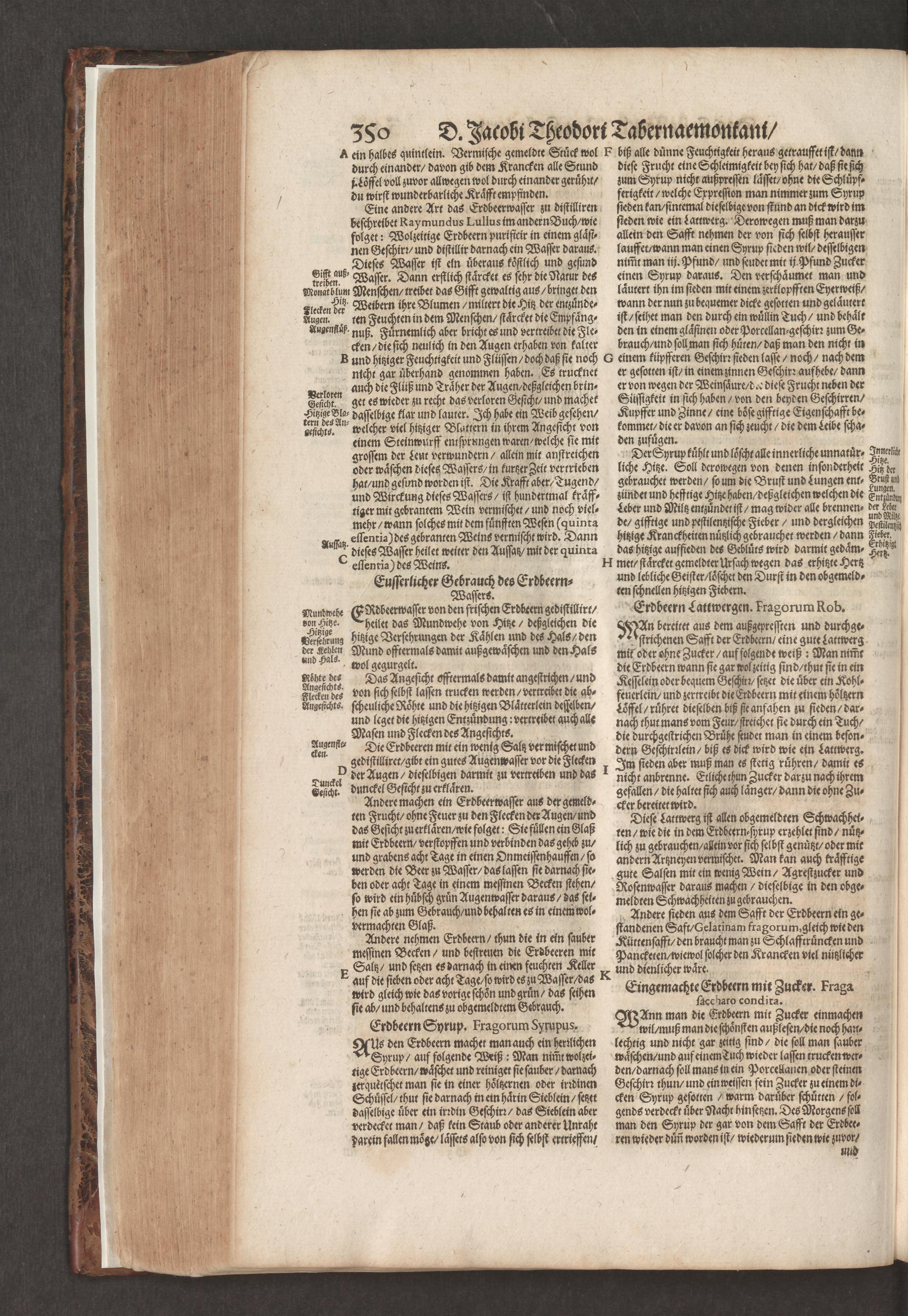 D. Jacobi Theodori Tabernaemontani, Neu vollkommen Kräuter-Buch : Darinnen Uber 3000. Kräuter/ mit schönen und kunstlichen Figuren/ auch deren Underscheid und Würckung/ samt ihren Namen in mancherley Sprachen/ beschrieben: Desgleichen auch/ wie dieselbige in allerhand Kranckheiten/ beyde der Menschen und des Viehs/ sollen angewendet und gebraucht werden/ angezeigt wird. Erstlichen durch Casparum Bauhinum D. und Profess. Basil. mit vielen neuen Figuren/ nutzlichen Artzneyen/ und anderem/ mit sonderem Fleis gebesseret/ Zum Andern Durch Hieronymum Bauhinum D. und Profess. Basil. mit sehr nutzlichen Marginalien, Synonimis, neuen Registeren und anderem vermehrt